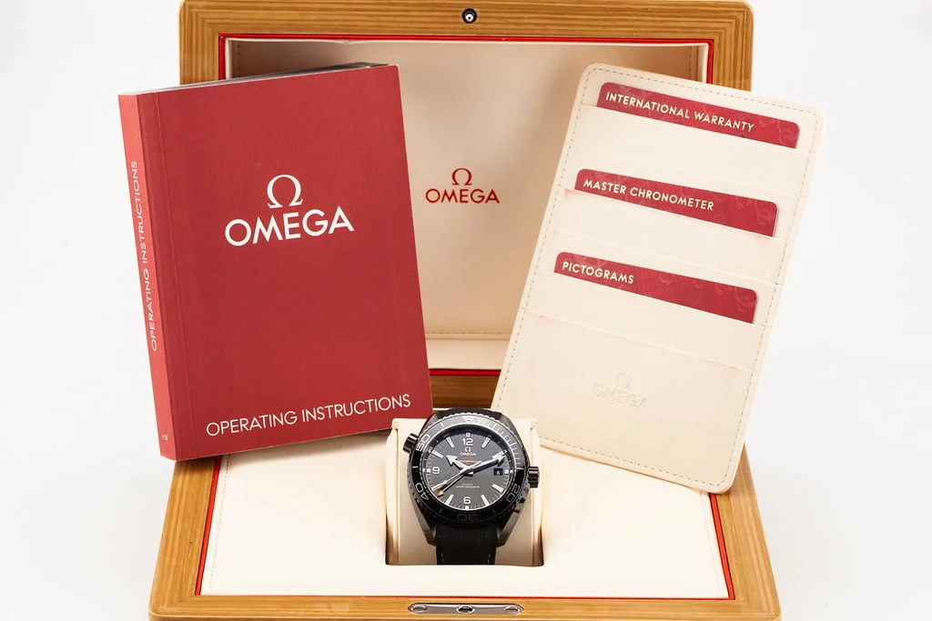 Up for sale is an excellent condition Omega Planet Ocean 600M GMT 45.5mm Deep Black Ceramic Case on Rubber Strap with Deployment Clasp, reference # 215.92.46.22.01.001. It comes with all boxes, papers, booklets, and Omega Warranty Card dated August 2024.