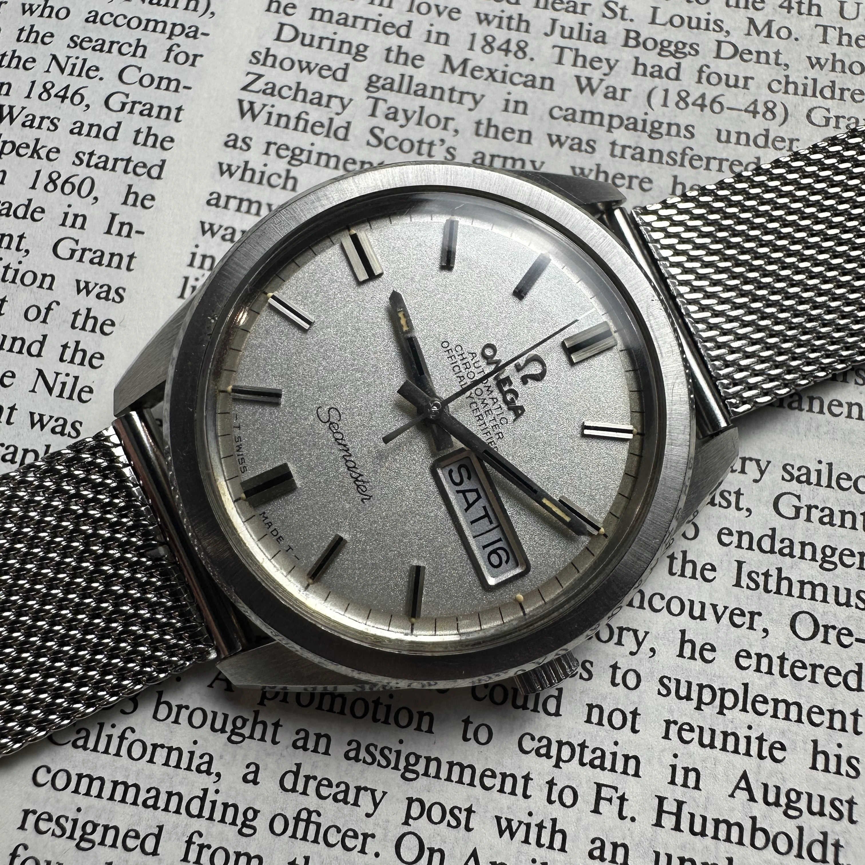 This model has a day-date complication and is powered by the Caliber 751. The 32 million serial number dates the watch to approximately 1970.