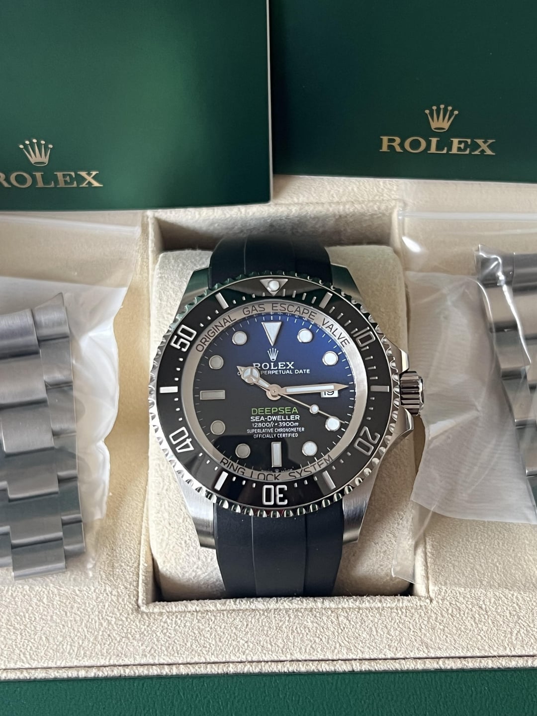 **Rolex Deep Sea James Cameron Gradient Dial on original bracelet and premium Rubber B strap** **Box/Papers:** Box + Appraisal **Condition:** [Preowned] Very Good **Case Size:** 44mm **Wrist Size:** 7.25” Images: https://imgur.com/a/Jj8qWUK Timestamp: https://imgur.com/a/2pGbMSg **Price:** $1️⃣1️⃣8️⃣5️⃣0️⃣ Shipped CONUS **Payment:** Cash, Wire, for established members Zelle and Paypal are also accepted **Trades:** Trades are welcome **Contact:** Consultants of Time is a licensed watch dealer in the state of New York and prides itself in providing quality timepieces, clear communication, fast shipping, and the utmost security for both your timepiece and your payment throughout the entire transaction. Established in 2018, we have numerous references across Google, Forums, and Facebook/Instagram Don’t hesitate to reach out to us for buying, selling, or consigning a luxury timepiece. **Sales Tax:** New York residents may be subject to sales tax. **Shipping:** Complementary and fully insured FedEx 2-day shipping within the continental United States. Shipping to Alaska, Hawaii, and US territories at additional cost. Overnight shipping is also available upon request. To ensure maximum security, all orders will be shipped to a local FedEx office for pickup with ID and signature confirmation. **International Buyers:** No international sales and shipping at this time. **Social Media:** Follow us for early access to new inventory and exclusive deals [Facebook](https://www.facebook.com/ConsultantsofTime/) [Instagram](https://www.instagram.com/consultants_of_time/)
