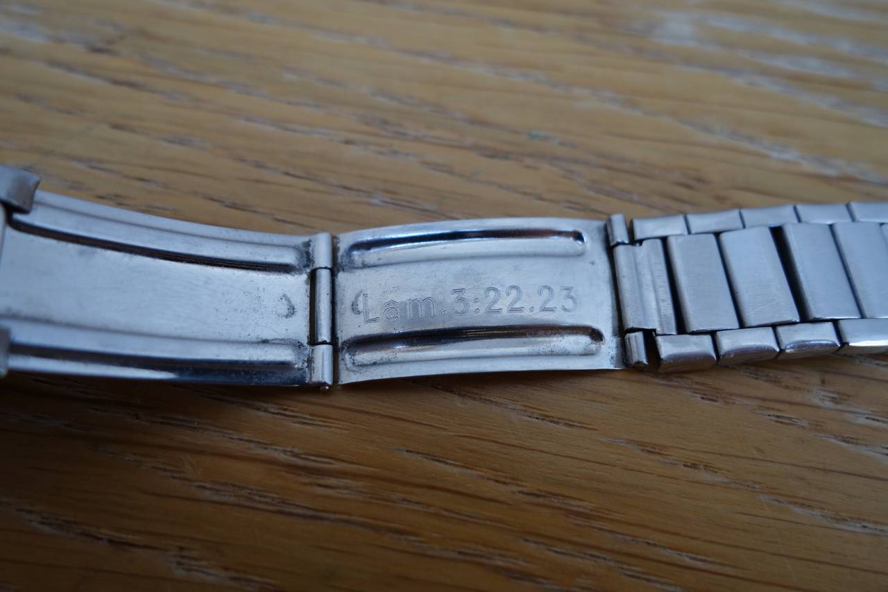 BRACELET: Omega 1039 with 516 endlinks is in very good condition. Clasp interior is stamped 3rd quarter of 1969. On the exterior is engraved "G.A. Furst Vietnam 11/68 - 11/69" and "Lam. 3:22:23" (Lamentations biblical verse) on the inside of one of the blades.
