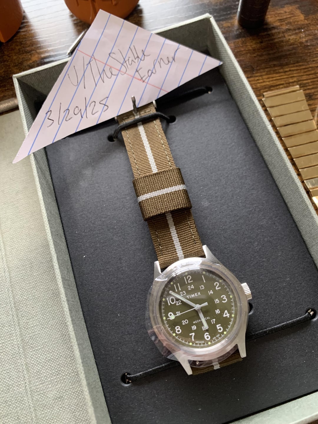 Hello everyone! I’m listing my Timex archive series MK1 mechanical! This is a hand winding watch with a beautiful olive green dial. It makes for a nice field looking watch. Like a mini Hamilton! What’s included and condition: The watch is in brand new condition and still has the plastic stickers on the front and back case. Never worn. The box and original strap are included and also in great condition. Dimensions: This watch is suitable for almost anyone as it has a 35- 36 mm case! And 10mm thickness Price and shipping: Price is 154 OBO including shipping within the United States. PayPal and Zelle. Don’t be afraid to make me an offer! Thanks for looking!