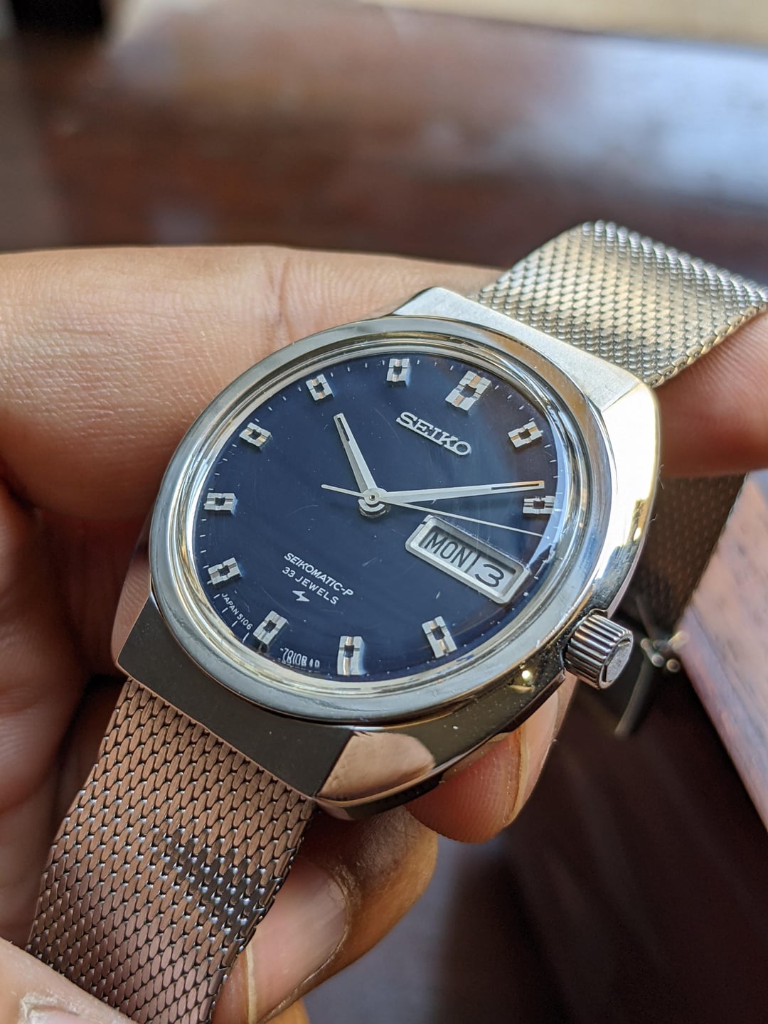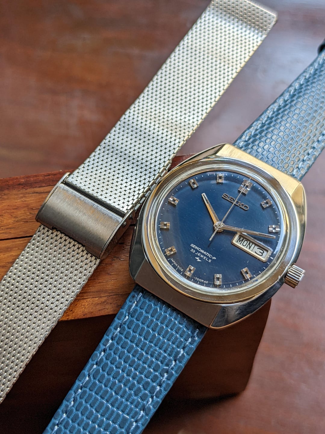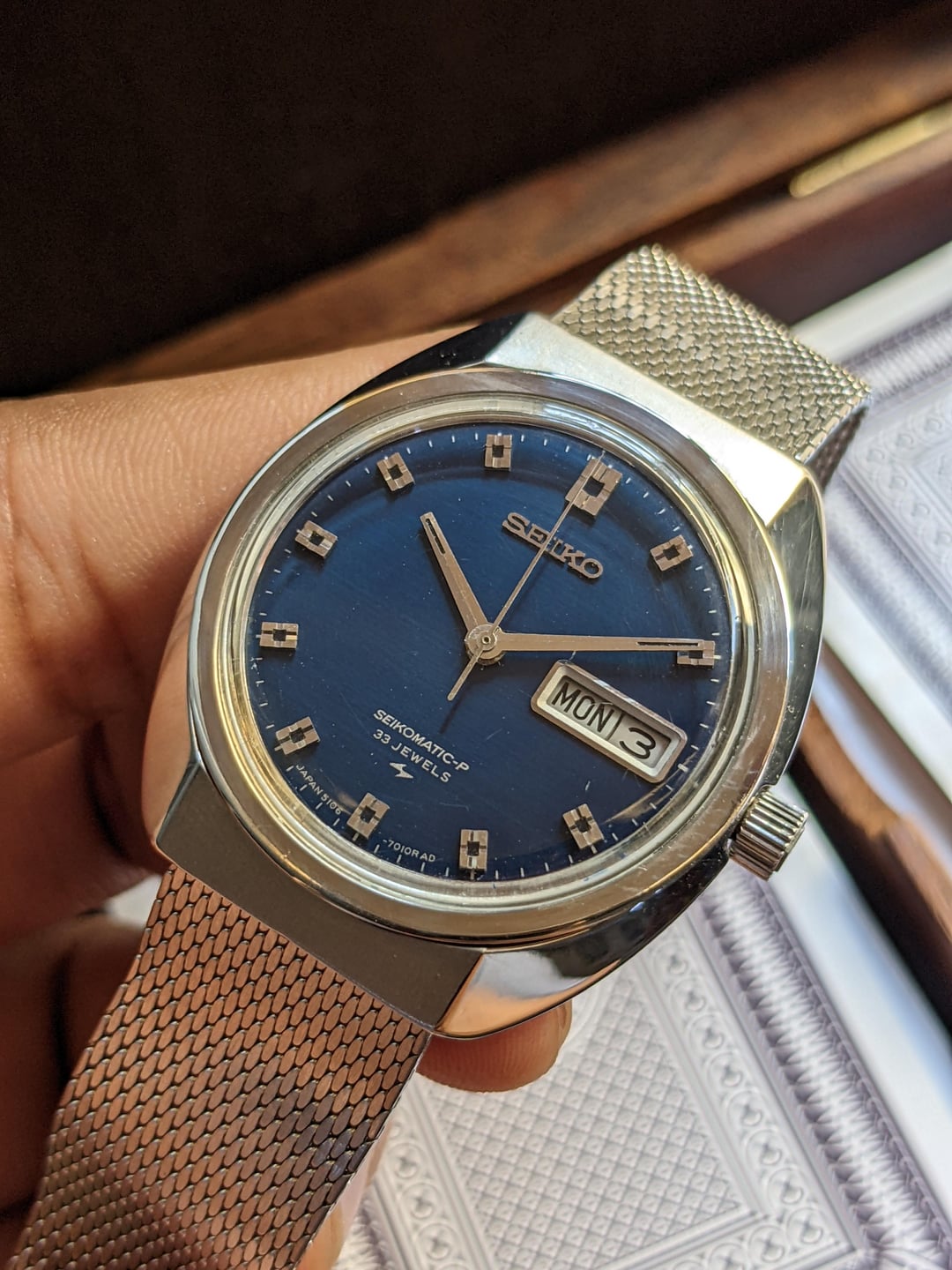 ![[WTS] Rare Seikomatic -P Automatic ⚙️ 33 Jewels 💎 Instant Snap Day & Date Complication with Gradient Blue Dial 🔵 Applied Indices - Japanese Mesh Bracelet + AM Leather Strap from June 1968 🗓️ for sale 💵 $265 (Shipped) 🚢 Video Attached 📽️ 6](https://cdn-cf.watchpatrol.net/600x600/img/full/a23f5b96465949798d480ecab475e9806caf8926.jpg)