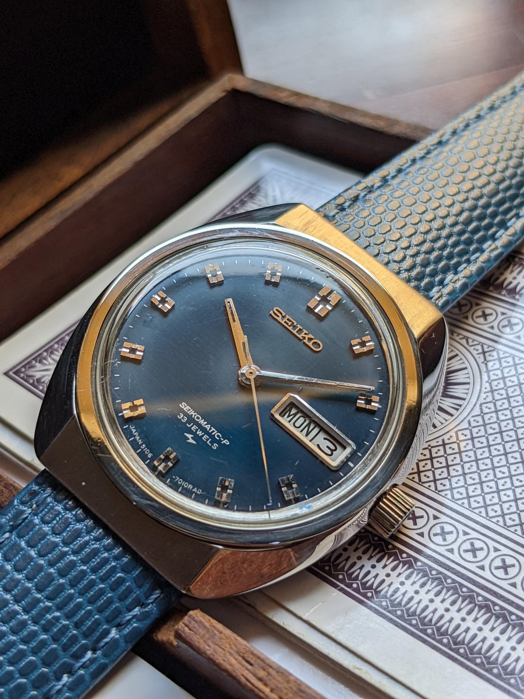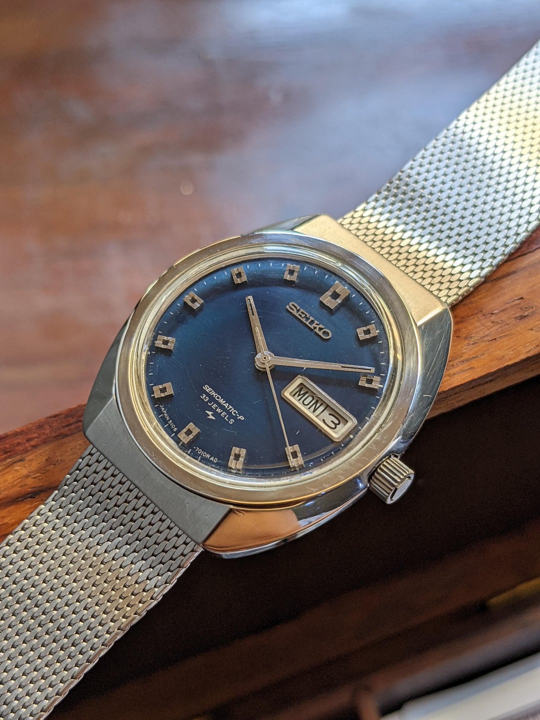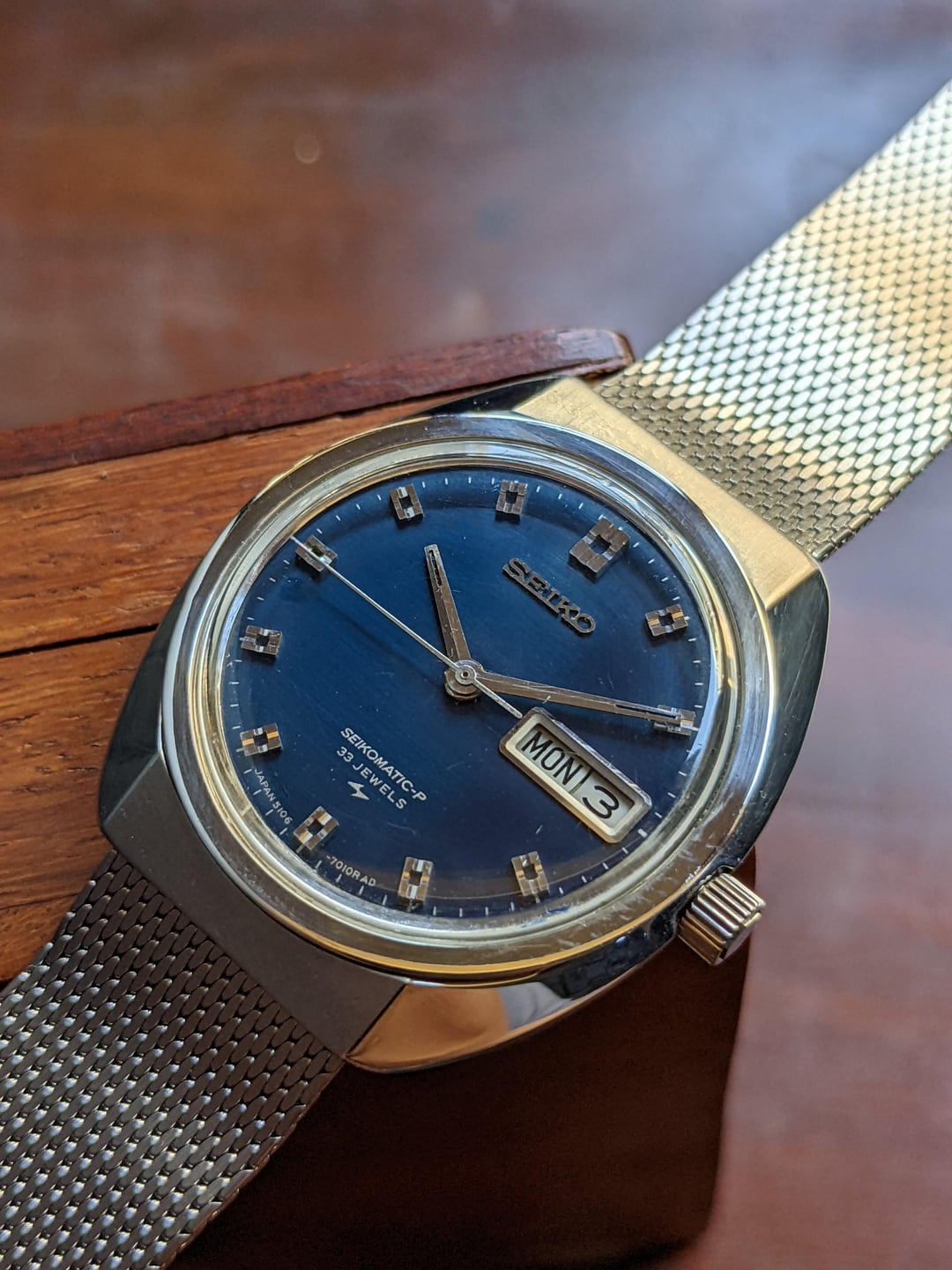 ![[WTS] Rare Seikomatic -P Automatic ⚙️ 33 Jewels 💎 Instant Snap Day & Date Complication with Gradient Blue Dial 🔵 Applied Indices - Japanese Mesh Bracelet + AM Leather Strap from June 1968 🗓️ for sale 💵 $265 (Shipped) 🚢 Video Attached 📽️ 6](https://cdn-cf.watchpatrol.net/600x600/img/full/a23f5b96465949798d480ecab475e9806caf8926.jpg)