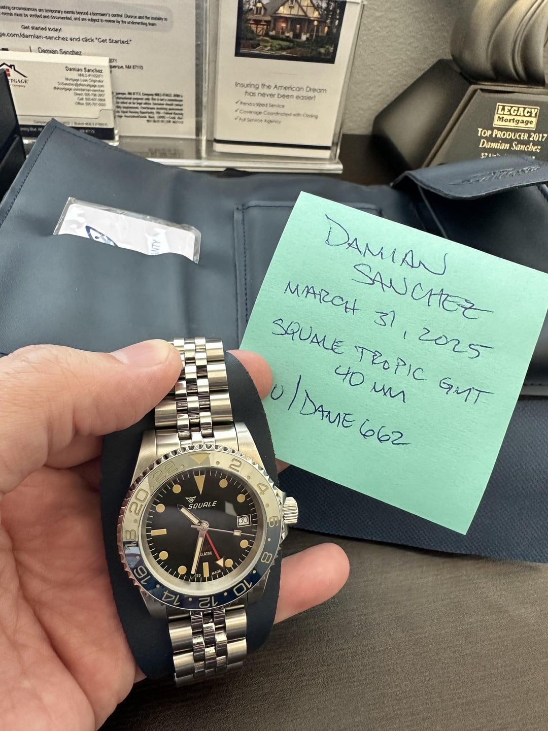 Up for sale is my Squale Tropic GMT Ceramica in 40mm which is a more vintage inspired piece with the grey/blue bezel (supposed to be a sun bleached black/blue) with the creamy mustardy vintage lume including a lumed GMT bezel. This watch is in “like new” condition, I can’t find a mark anywhere and includes a full kit including a color matching unworn NATO and spring bar options. The Swiss Sellita SW330-1 movement is one of the most accurate in my collection, around +2-3sec/day. It’s a lot more wearable than the 42mm version they first released plus it doesn’t have the cyclops that the bigger version has, making it a more clean look. Movement: ETA 2893-2/Sellita 330-1 Case: 40mm Lug to lug: 47mm Lug width: 20mm Thickness: 12.5mm Bi-directional 90 clock GMT bezel with two-tone ceramic insert Priced at $650 with everything. Chasing after a Wise Damascus GMT black/grey “Bruce Wayne” so that would be my only trade but feel free to shoot your shot. Prefer to sell so I can buy the one I want. Timestamp and photos: https://imgur.com/gallery/75tN8Sp
