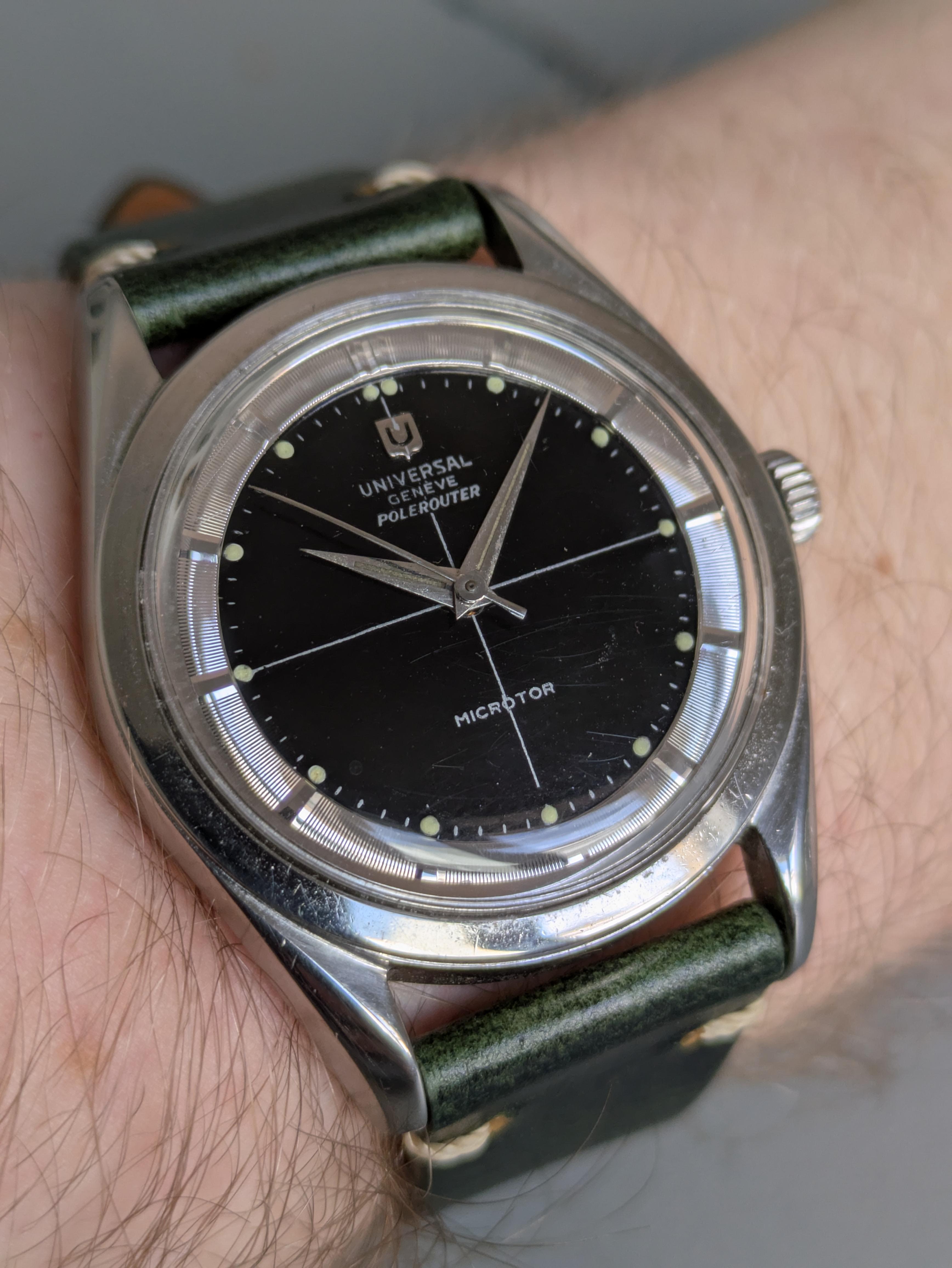 Hello all - I’m putting this beautiful Universal Genève Polerouter for sale. [Album](https://imgur.com/a/Y7BiMBx) [Timestamp](https://imgur.com/a/VqBttK7) This is a rare early reference 20360-1. This specific model is a rare “microrotor only” variant of the Polerouter. Very few were made before Universal got sued by Buren for copyright infringement, forcing them to put “automatic” on the dial instead of “microrotor”. You can read the full story [here](https://universalgenevepolerouter.com/collectors-note-the-microtor-only-dials/). Condition: good overall vintage condition. The case appears to be very lightly polished, with some scratches here and there. The movement is in good shape - I had it checked by a watchmaker, but didn’t do a full service. Replacement crystal. Important note: the dial has been redone, but the inscriptions are correct - this is indeed a microrotor only watch, as evidenced by the serial and model number, as well as the “patent pending” calibre. Selling this one because it wasn’t getting enough wrist time and I’m currently slimming down my collection. Price: 2349 USD + shipping (insurance optional). I accept bank transfer, Paypal (you pay the fees) and Wise. Not looking for trades on this one. I am located in the EU. I can take more photos and videos on request. Happy to show it via a video call as well. Reach out via PM (I don't check chats often) if you have any questions - comment here if you sent me a PM.