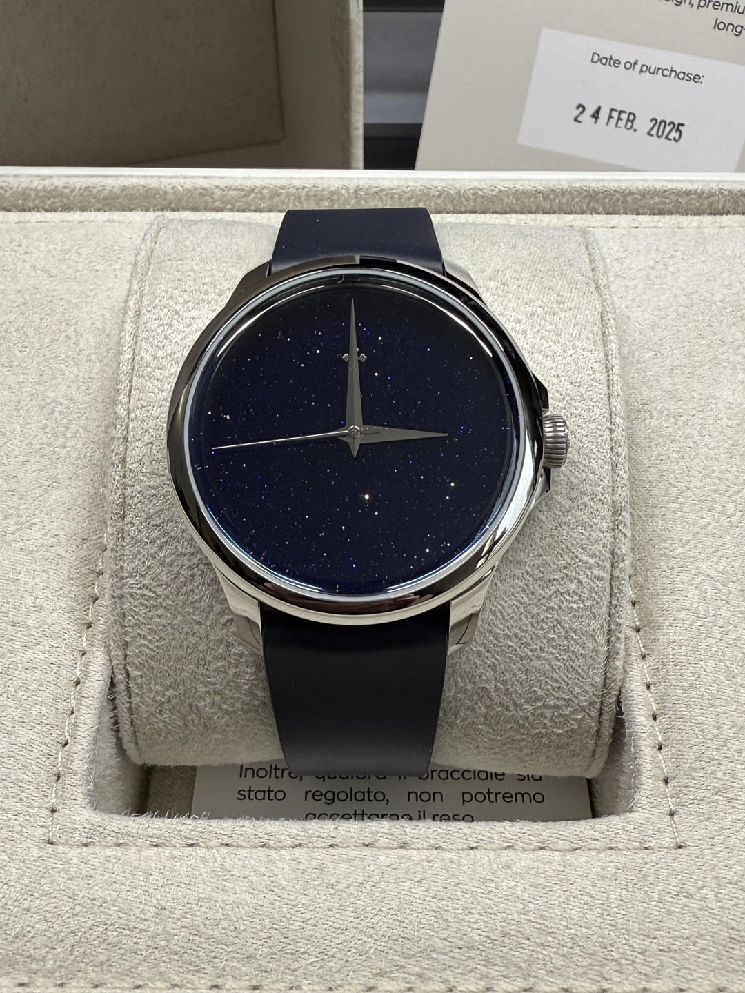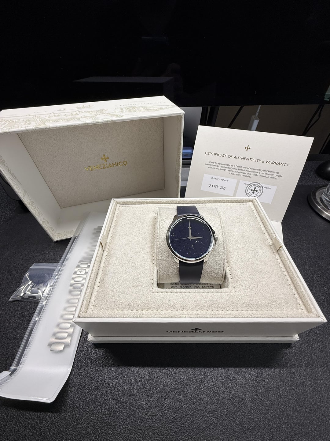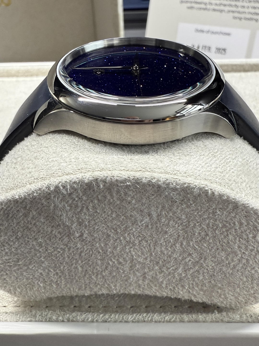 Hey folks Really amazing new dial from Venezianico - the Avventurina from the Redentore collection. This is the 40mm size. Comes with both the bus leather strap and the additionally purchased bracelet ($85). Please see pics, took many photos of all sides of the watch. tehre are some hairlines on one side of the case so please take a look ant teh pics. Great looking watch and absolutely shimmers and sparkles in the light. Very cool to see on the wrist. But a difficult watch to photograph :) I will leave below some specs from their website. $575 shipped via USPS Priority conus only PayPal F&F preferred (G&S ok but you will have to pay the addt 3% PayPal fee). I have 15 positive transactions here with good feedback so please read them. Also have an eBay store with hundreds of sales and hundreds of positive feedback so read them as well (offtherakcollectibles) Sale only, no trades. Ships from NYC so if you’re in area can meet up locally. Please leave a comment here so I can view your transaction history and then message me if you’re interested. Thanks! \--------------- Avventurina is a precious glass material, discovered in Venice in the 17th century by the Murano artisans. It's renowned for its shimmer resembling a starry sky, achieved by incorporating small fragments of copper during the production process. **CASE**: 316L Stainless Steel **DIAL**: Aventurine glass **DIMENSIONS**: Ø40 mm, 46.7mm lug to lug, 11mm thickness **MOVEMENT**: Seiko NH35A Automatic **CRYSTAL**: Sapphire crystal with anti-reflective coating **BEZEL**: 316L Stainless Steel **WATER RESISTANCE**: 5ATM (=50m) **STRAP**: Real leather, Made in Italy