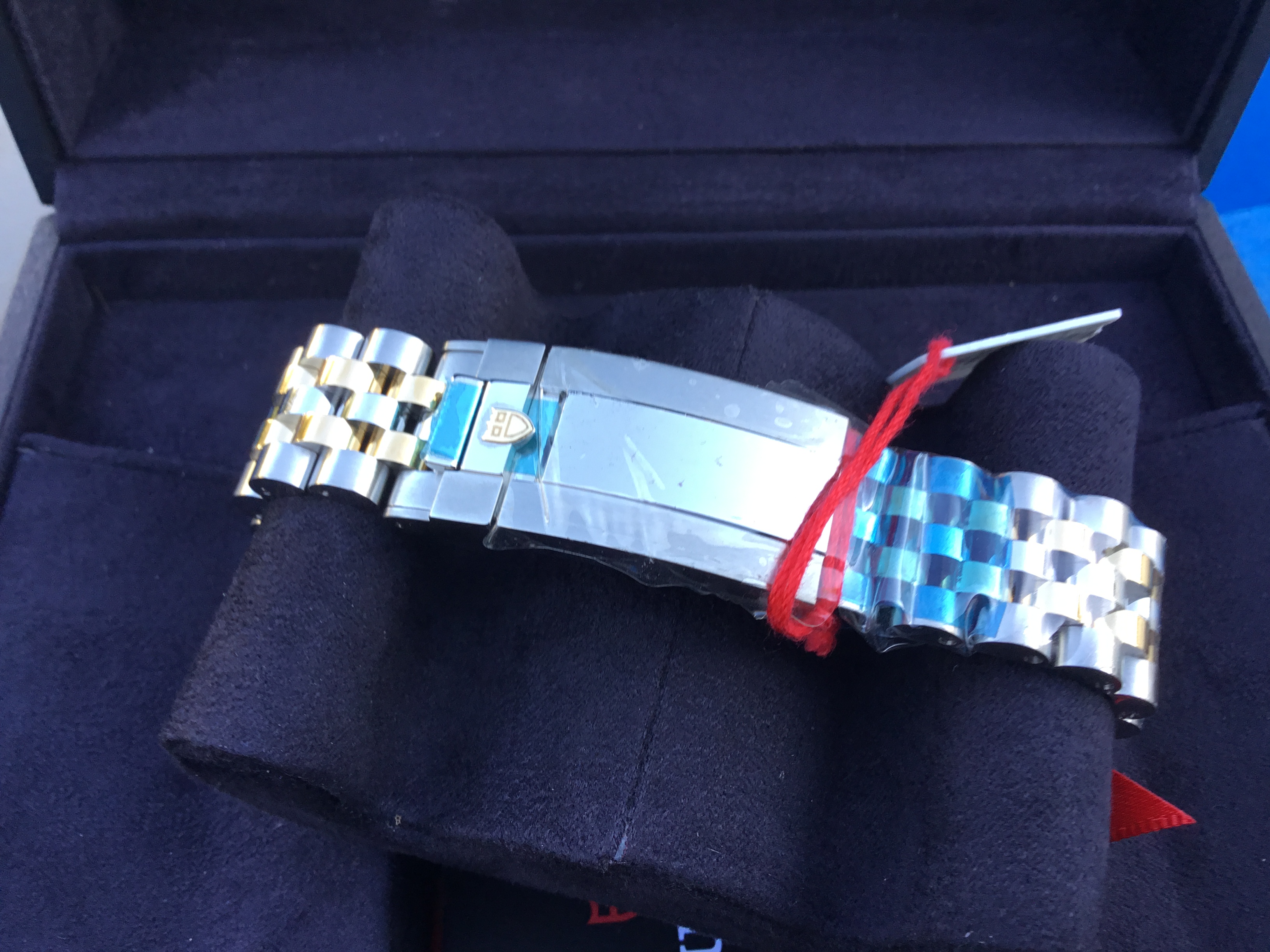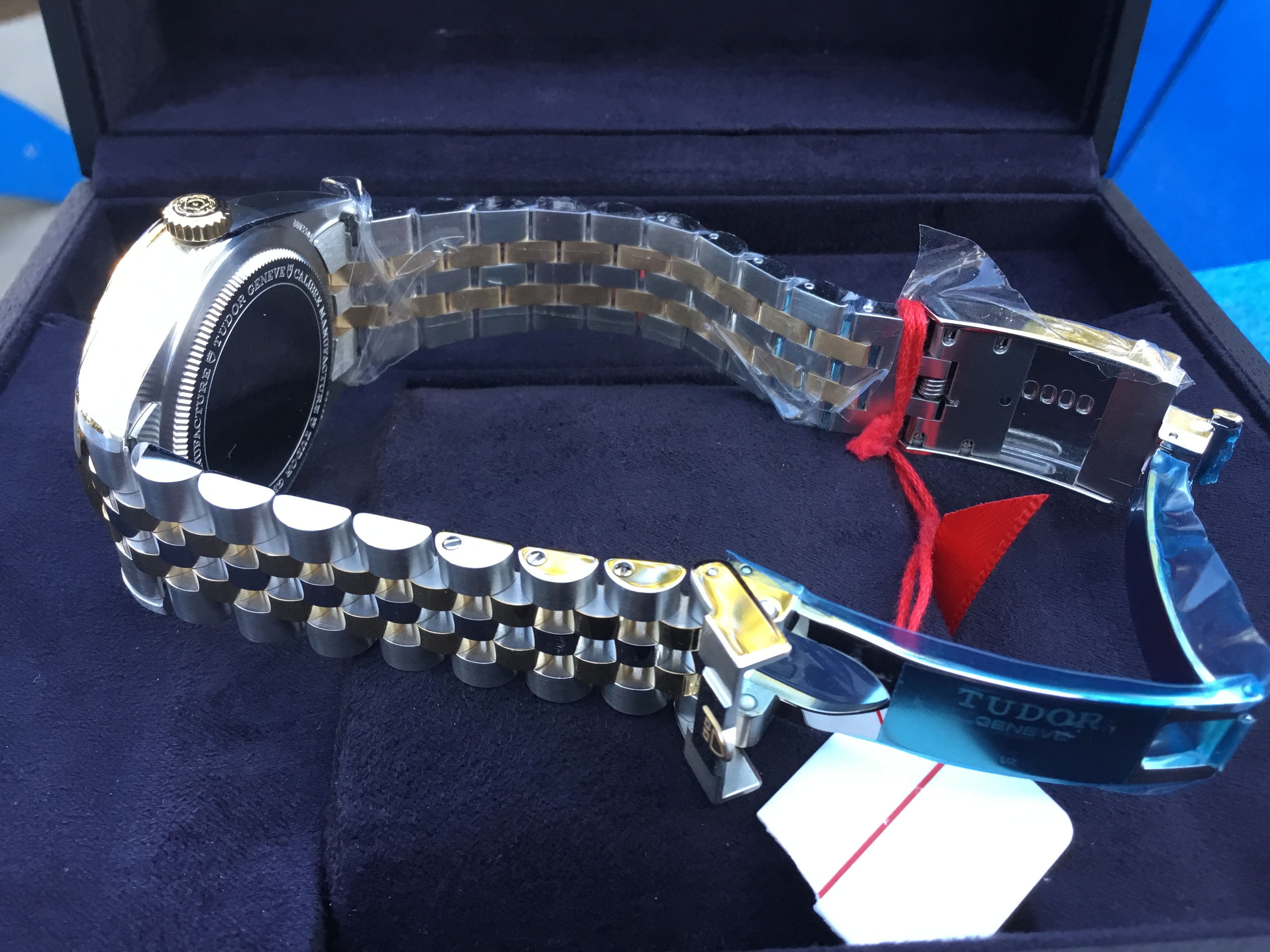 It sits on a beautiful bracelet, first center links in steel, remaining center links in steel covered by a 0.2mm yellow gold cap. TUDOR "T-fit" folding clasp with safety catch. The logo on the catch is made of solid yellow gold.