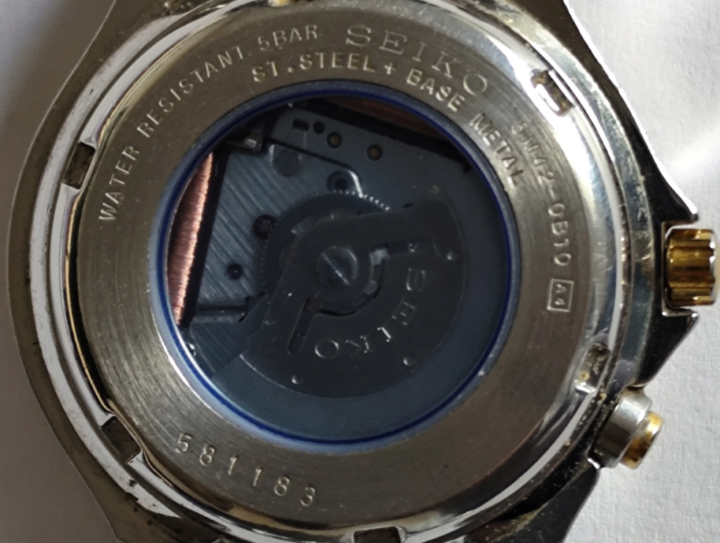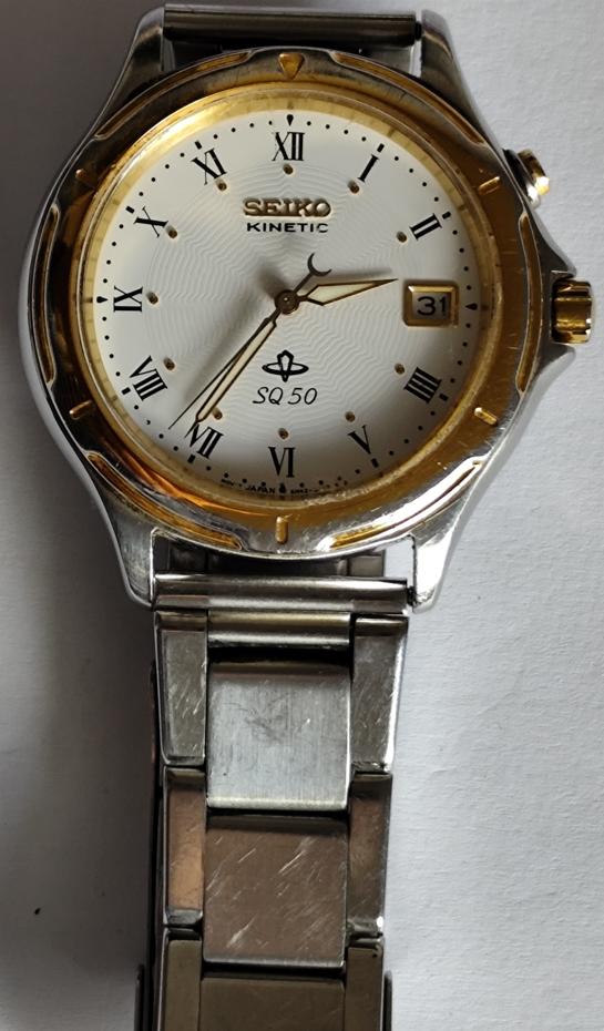 Je vends cette Seiki Kinetic SQ50 bi-ton de 36mm. Le mécanisme est visible avec le fond transparent. La montre démarre, mais il faut changer la batterie. Prix 50€ fpi