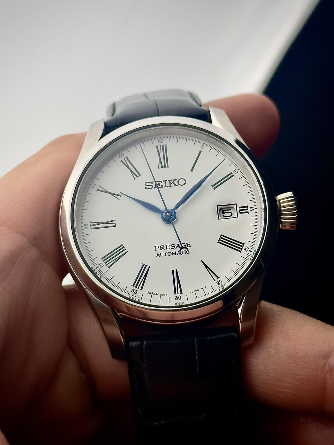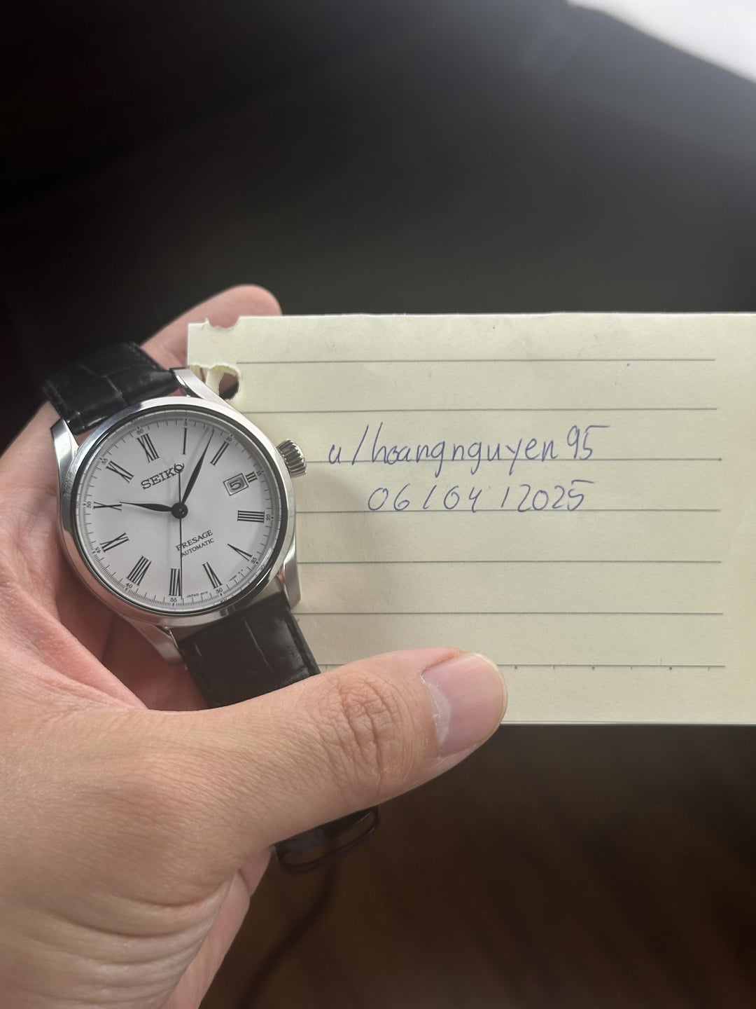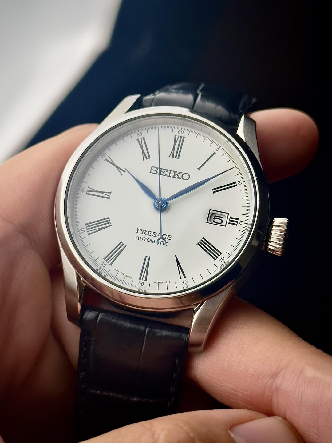 Up for sale is the Seiko Presage Enamel Dial SARX049 (SPB047) in excellent condition. Images: https://imgur.com/a/ffWSyOd Video: https://imgur.com/a/YBS5irN Timestamp: https://imgur.com/a/MOLBjTK Back in 2017, Seiko introduced a new addition to the Presage collection — a series of four watches, each featuring a hand-crafted enamel dial with elegant Roman numerals. Among them was the Seiko SARX049 (also known as SPB047), a clean three-hander that debuted at Baselworld. It draws inspiration from Seiko’s earliest timepieces while showcasing the art of traditional Japanese enamelling. The standout feature of the SARX049 is undoubtedly its enamel dial, created by master craftsman Mitsuru Yokozawa and his team at Seiko’s headquarters in Japan. The glossy white enamel, contrasted beautifully by crisp black Roman numerals and lettering, offers excellent legibility in daylight and a level of refinement typically seen in much higher-end watches. It’s a fine example of Japanese craftsmanship, holding its own against Swiss counterparts in the same category. The watch measures 40.5mm in diameter, 47.6mm lug-to-lug, with a thickness of 12.4mm and a 20mm lug width. It runs on the in-house 6R15 automatic movement with 23 jewels, beating at 21,600vph and offering a 50-hour power reserve. Accuracy is rated at -15/+25 seconds per day. A sapphire crystal protects the dial, and water resistance is rated at 100 meters, making it practical for everyday wear in any weather. This watch is in excellent condition with minimal scratches and showing very little signs of wear. The original leather strap remains unworn with no creases, as the watch hasn’t seen much wrist time. It has also been recently serviced and is keeping time well. While the original box is not included, a standard Seiko box will be provided upon purchase. Price: $550 (retail price was over $1000 MSRP when it was first released) + $35 flat shipping (via FedEx/DHL – shipping costs me around $70-$80, so I cover half). Payment via PayPal F&F or G&S (+4.6% fee covered by the buyer). Not accepting trades. Feel free to message me with any questions or if you're interested. Have a great day!