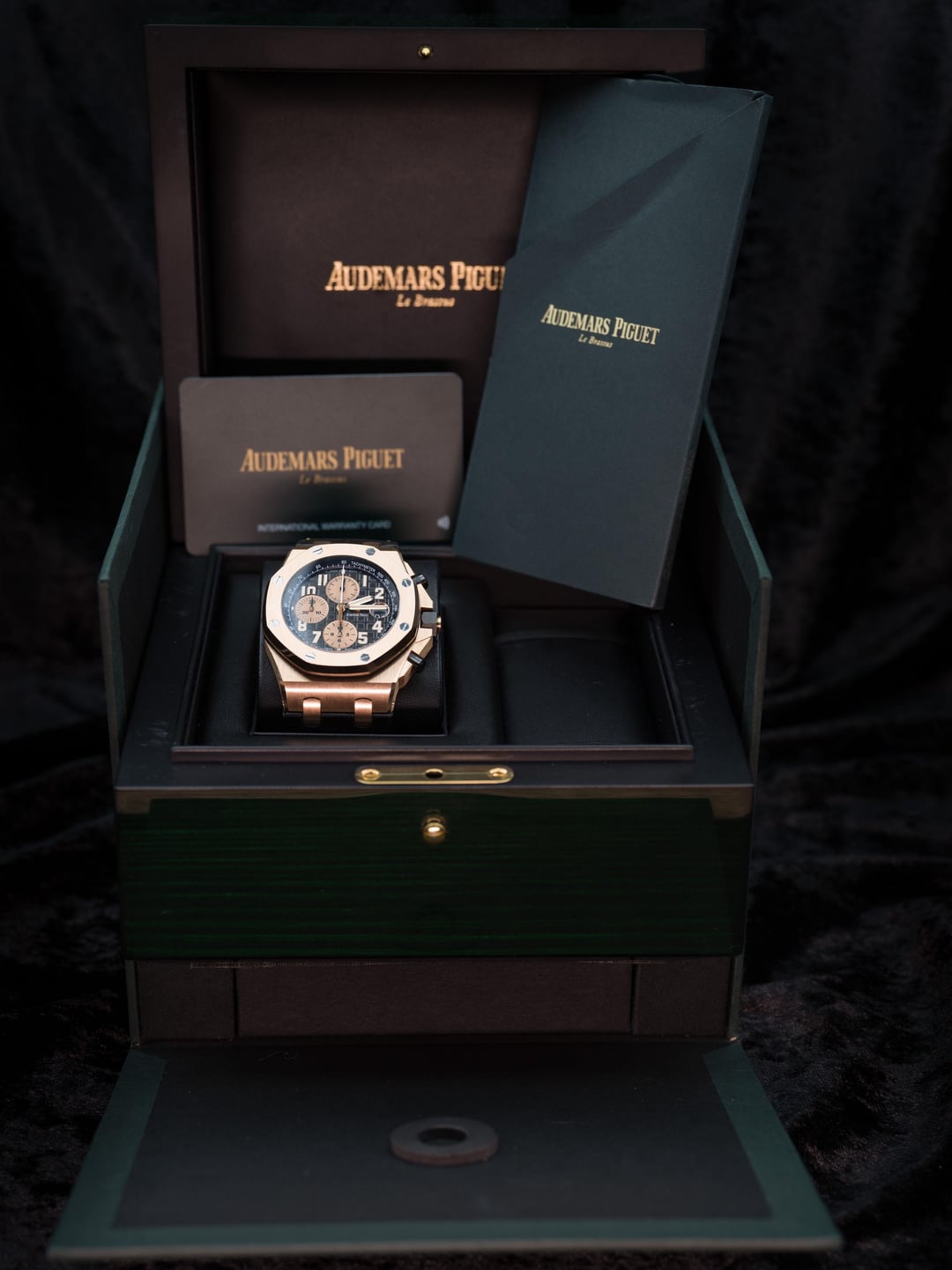 AP Offshore 26470OR.OO.A002CR.02.A - Rose Gold (2021) Price: $41,195 Complete Package: • Full set with inner/outer boxes • warranty card • All manuals and documentation • Manufacture Date: 2021 • Includes Wristlock 12-month warranty Description: The luxurious AP Offshore 26470OR features an exquisite 42mm 18k rose gold case paired with the iconic “Méga Tapisserie” pattern dial. This timepiece exemplifies AP’s mastery of luxury sports chronographs. Highlights: • 42mm 18k rose gold case • Black “Méga Tapisserie” pattern dial • Automatic chronograph movement • Exhibition case back with 22k gold rotor • Sapphire crystal with anti-reflective coating • Black alligator strap • Chronograph function with small seconds • Water-resistant construction • Includes 12-month Wristlock warranty Technical Details: • Case Thickness: 14.21mm • Movement: 3126/3840 self-winding • Power Reserve: 50 hours • Water Resistance: 100m Note: Each watch is thoroughly authenticated through our verification process, including detailed inspection and watchmaker verification. Comes with 12 month limited warranty!. Please don’t hesitate to reach out to me with any questions. I deal with complete transparency and want to help you with not only this purchase, but many more in the future. N. Orleans La