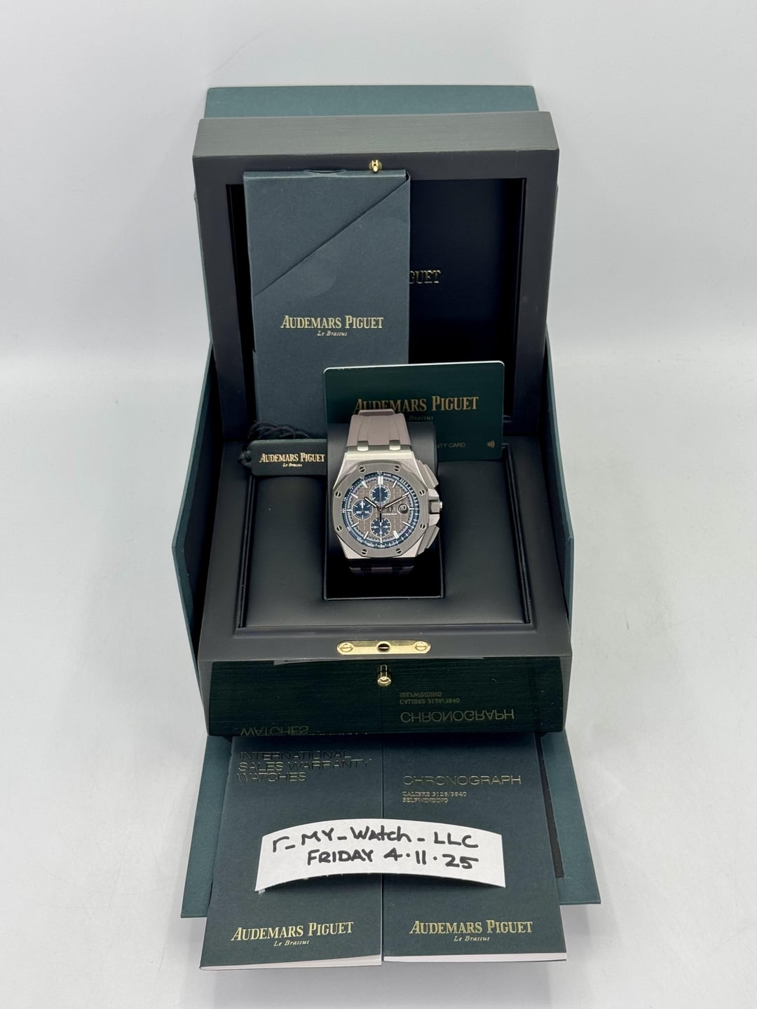 🔵2021 Audemars Piguet Royal Oak Selfwinding Chronograph 44mm 26400IO Titanium and Grey Ceramics Grey “Méga Tapisserie” dial enhanced with a subtle touch of blue. 🔵TRADE or SELL us your luxury watch, all brands considered. Message me details. **Includes the following:** ✔️Original Audemars Piguet Double Boxed ✔️Box and Papers - Yes ✔️Warranty card ✔️International Warranty valid thru January 2026 ✔️Manual and Warranty booklets ✔️Leather Hang Tag ✔️Material: Titanium and Ceramic ✔️Size: 8.75inch wrist (Adjustable Rubber Strap) ✔️Reference #: 26400IO.OO.A004CA.02.A ✔️Watch is in excellent overall condition. Please see photos for details. ✔️Trades welcome ✔️Appraisal included Business Name: **My Watch LLC** LOCATION: Oak Park, Michigan ✔️[MyWatchLLC.com](http://mywatchllc.com) for current inventory ✔️Google Business Listing [https://g.co/kgs/Cmd6FPW](https://g.co/kgs/Cmd6FPW) ✔️Business Hours M-F 9-6 ✔️Facetime/Video chat/calls welcome to view the watch interested. ✔️Contact: 248-422-0909 via text or call for quickest response. 🟢TERMS: Visit [MyWatchLLC.Com](http://mywatchllc.com) for payments accepted 🟢REFERENCES/REVIEWS: We are well reviewed on all platforms from google, trust pilot, rolexforums, additionally we have 300+ reference in multiple FaceBook watch groups, reference checks welcome. 🟢SHIPPING: If you are not local, we offer Fully Insured FedEx overnight shipping in the USA for a fee. International shipping available.