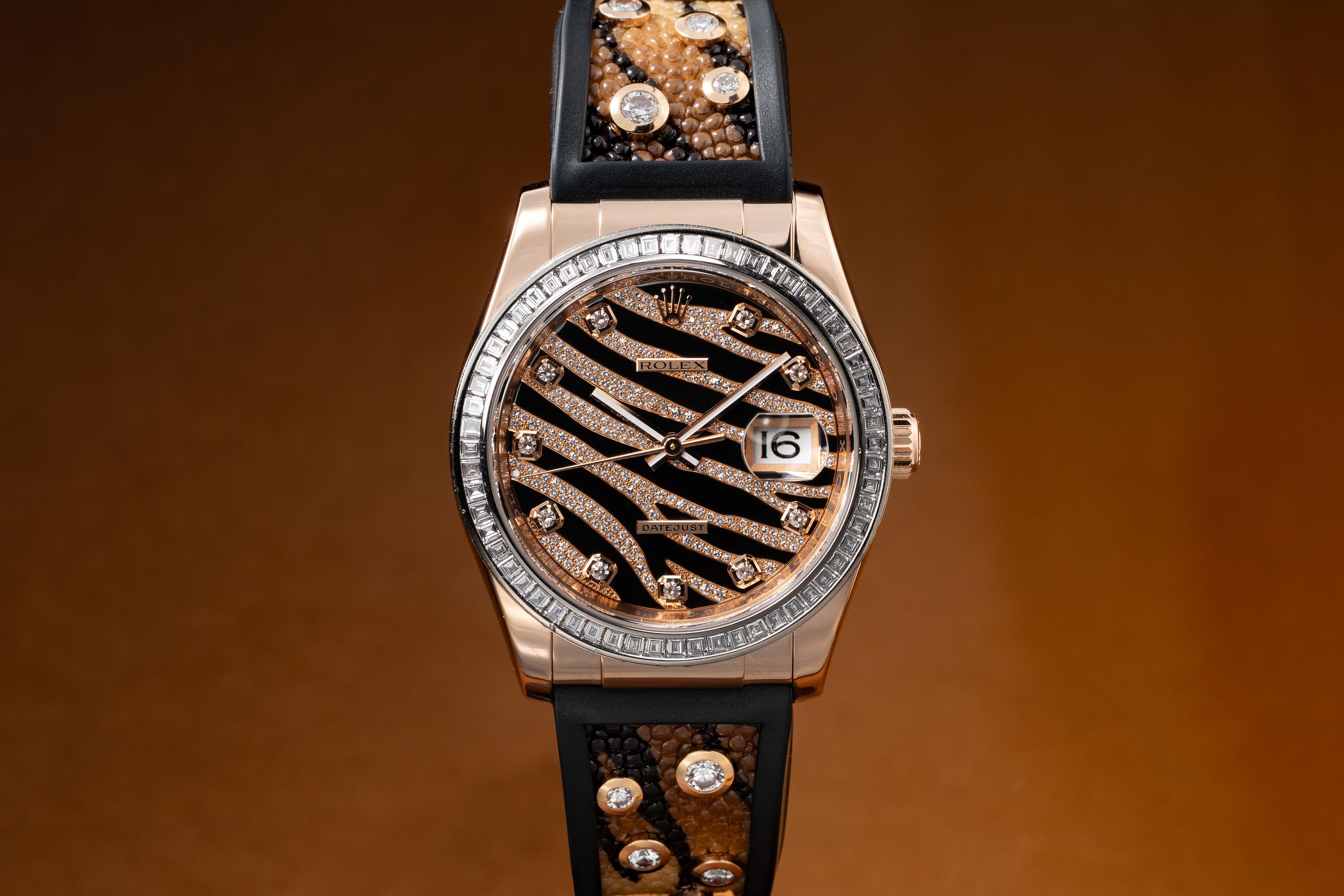 Description: Case: The 36mm 18K rose gold case is excellent, showing only very light wear from use. The 18K rose gold & baguette diamond bezel is also in excellent condition, showing only light wear from use. Dial: The Diamond pave "Zebra" dial is excellent, showing no visible wear. The original factory hands are matching. Bracelet: The diamond set rubber & stingray bracelet is excellent, showing only very light wear. The 18k rose gold clasp is also in excellent condition, showing only light wear from use. Accessories: Box and papers. Notes: It really doesn't get much rarer than this.