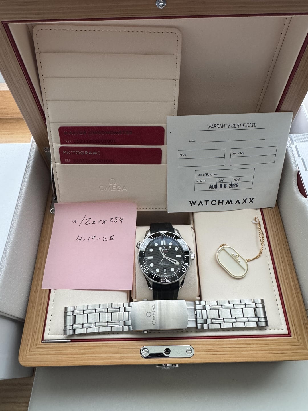 Omega Seamaster 300m black Great condition - hairlines on case and small nicks on side of case, as pictured, but not very noticeable. Some scratches on lugs from strap changes. Keeping perfect time. Purchased new 8/2024 through Watchmaxx. 2 year warranty through Watchmaxx Comes with OEM stainless steel bracelet and OEM rubber strap. Both in perfect condition. Serial is marked out in the picture. Asking $3700. Zelle or PayPal G&S (+3.5%)