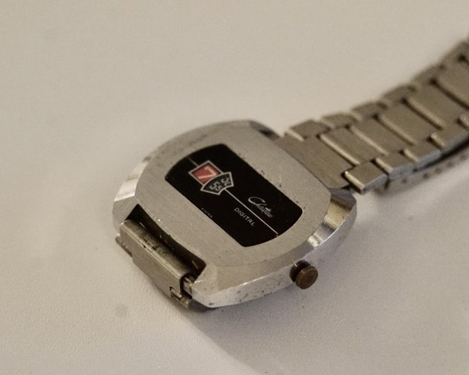 Step into the retro future with this 70s-era **mechanical digital** from Clyda — a wristwatch that tells time through spinning disks instead of hands. No batteries, just gears and attitude. 🕹 **Details:** * Brand: **Clyda** (Swiss) * Movement: **Mechanical hand-wind jump hour** * Display: Disk-based “digital” hour/minute layout * Case: Brushed steel, rounded rectangular (\~35mm wide) * Crystal: Acrylic, shows some age * Crown: Operates smoothly * Bracelet: Integrated folded-link bracelet, fits medium wrist (\~7”) ⚙️ **Condition:** * Winds, runs, and jumps as it should * Case and bracelet show signs of wear — consistent with age * Crystal has light scratches, legibility unaffected * Overall well-preserved for a 50-year-old digital mechanical 💬 **Why It’s Awesome:** Before LCDs took over, this is what digital looked like. A mechanical watch that feels like a sci-fi prop, and a conversation starter every time you check the time. These are getting rarer — and cooler — by the year. 💸 **Price: $95 OBO** 🚚 **Ships within 24 hours** 📦 PayPal F&F / Zelle / Wise 📍 Located in Cambridge, MA — happy to meet locally 📣 Offers welcome. Bundle-friendly. Let’s move this little slice of retro tech today.