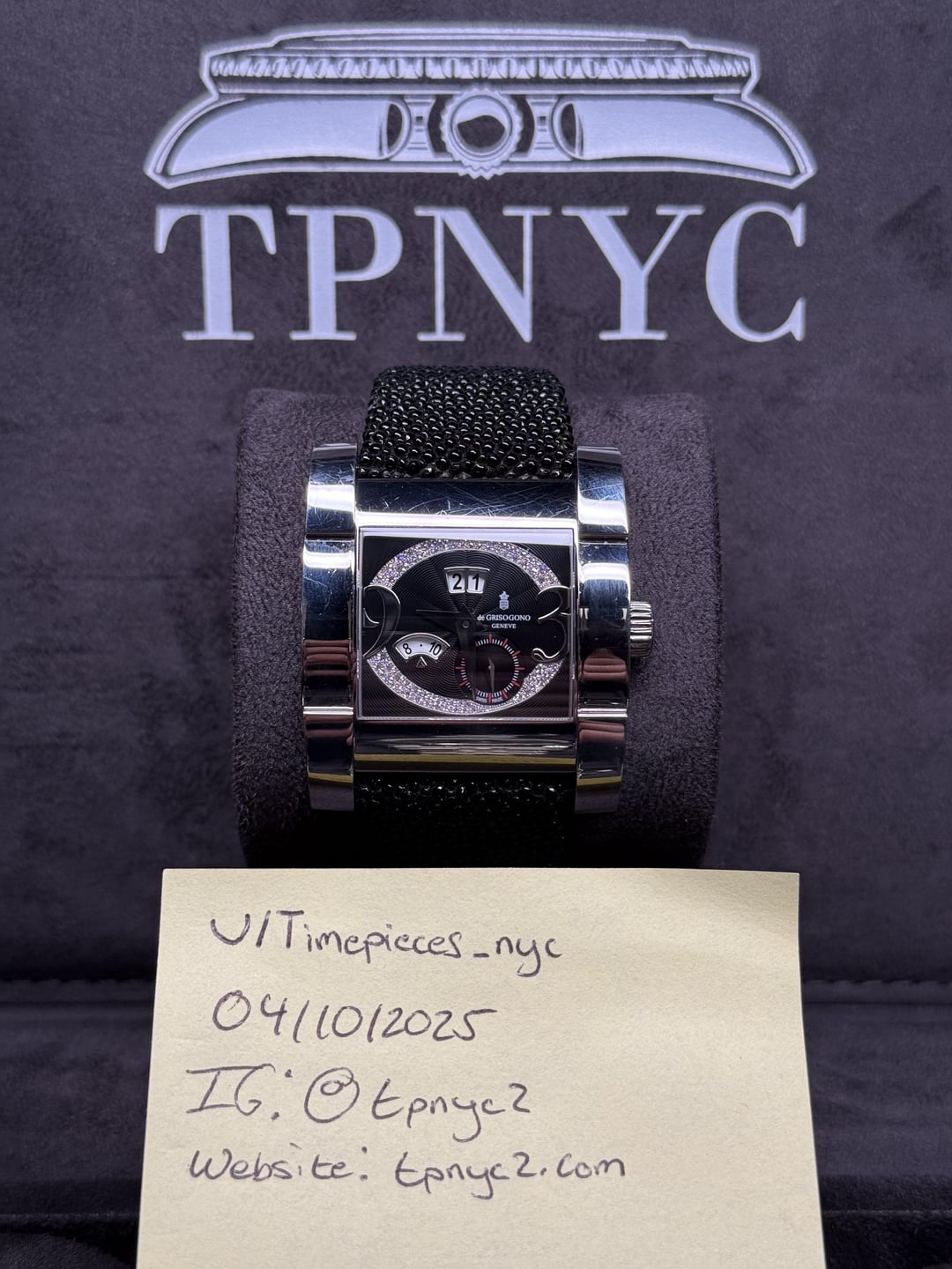 De Grisogono Novantatre Black Diamond Dial on Strap 2011 Set Preowned **Physical condition:** Preowned, please refer to the photos for the most accurate account of condition. **Mechanical Condition:** Running well **Box and Papers:** Complete from 2011 **Price: $2,750**. **Payment methods:** Zelle, Bank Wire, Crypto (USDT + 3%). We ship within 24 hours after payment clears. Willing to ship anywhere internationally if buyer covers shipping. Additional ways to contact us: Corresponding on Reddit can be a pain sometimes. If you have further questions and need another way to connect, you can visit our website tpnyc2.com or Instagram @tpnyc2!