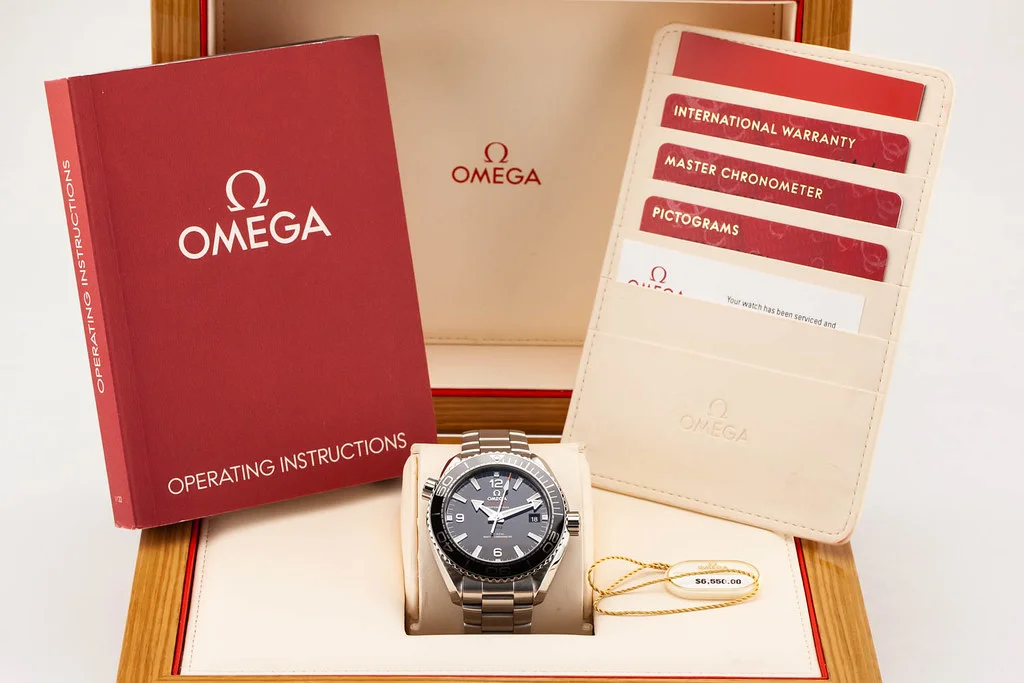 Up for sale is an excellent condition Omega Planet Ocean 8900 Black Dial on Bracelet, reference # 215.30.44.21.01.001. It comes complete with all boxes, papers, booklets, hang tag and Omega Warranty Card dated April 2019. Underwent Omega Complete Maintenance Service as of February 2025