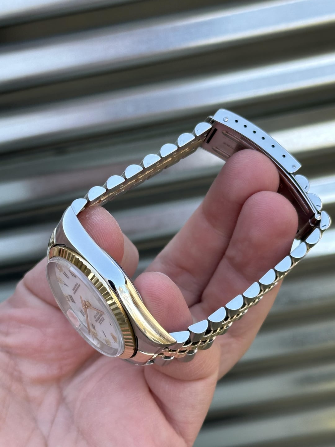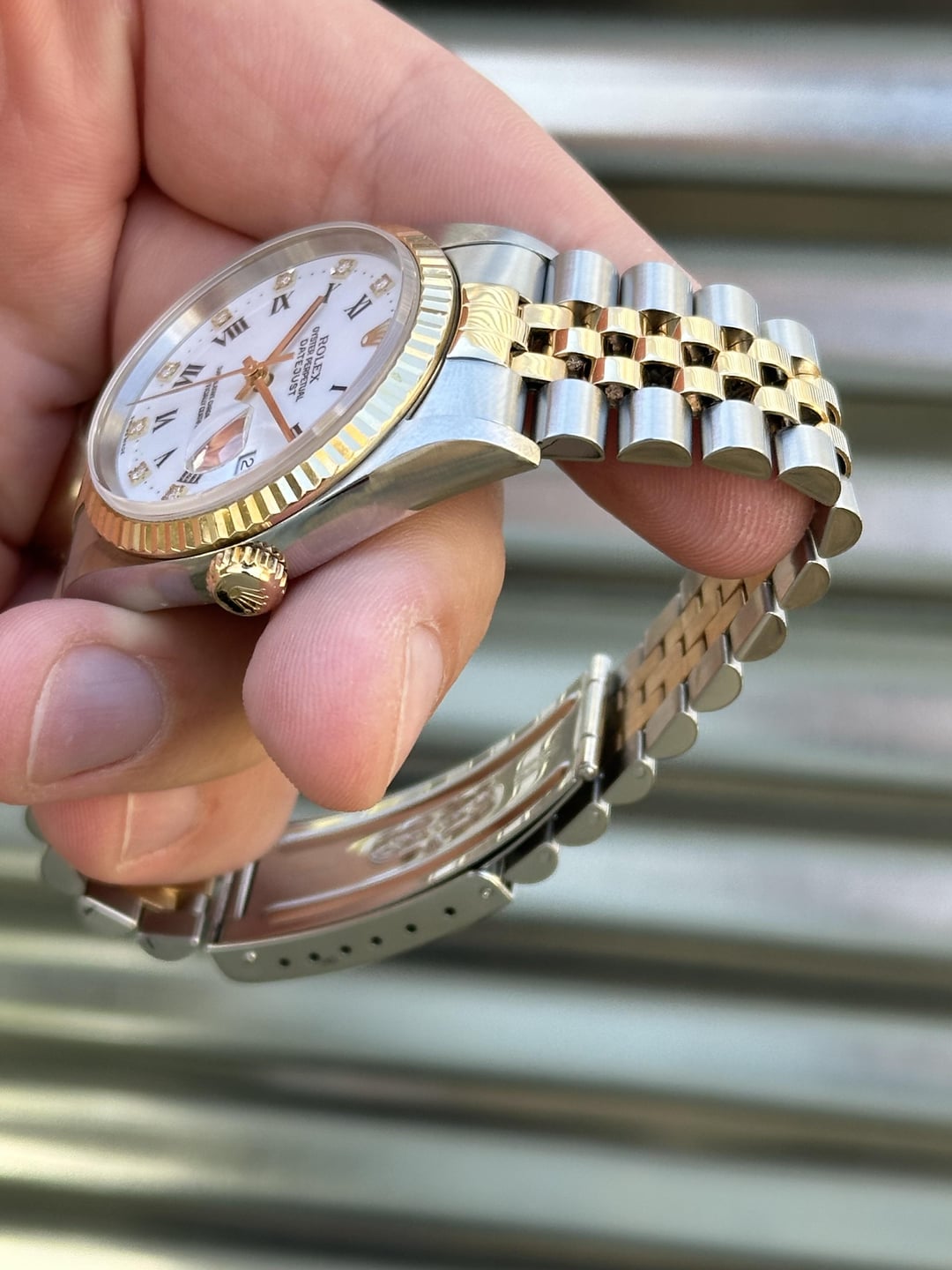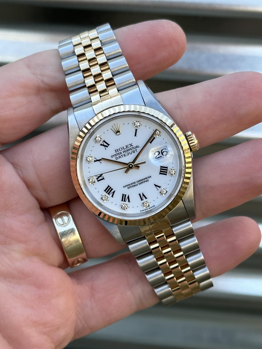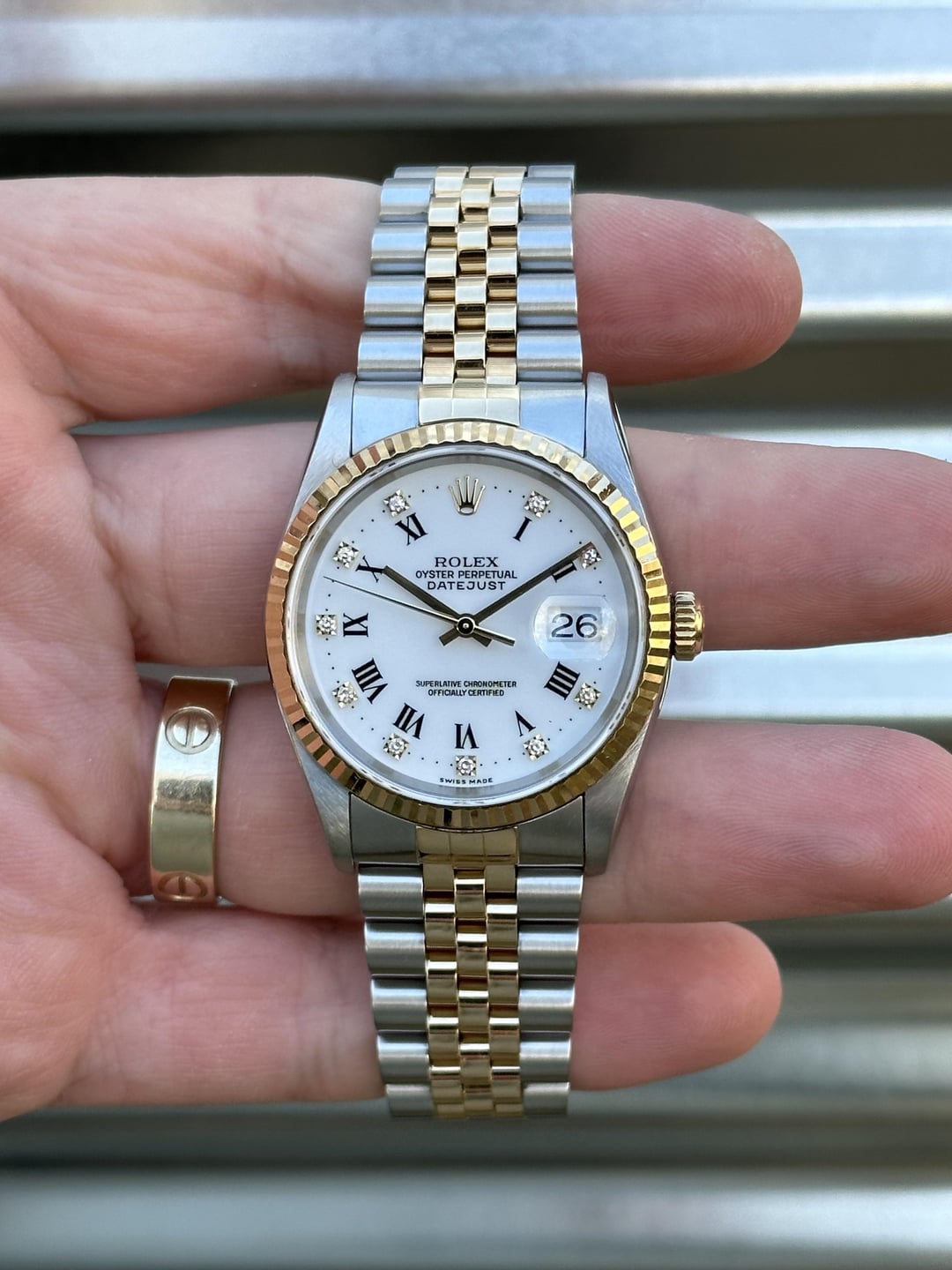 Here is a two-tone 36mm Rolex Datejust Reference 16233 with a unique White Roman Numeral dial with diamond indices. It features an 18k gold fluted bezel on a solid no-holes case with a jubilee bracelet. It comes complete with Box & Papers. Reference number: 16233 Serial number:  P***** serial which dates this watch to 2000 COMES with BOX & PAPERS, HAND TAG,Serialized tag, BOOKLETS, (see second picture for everything that’s included) 💰6️⃣8️⃣5️⃣0️⃣+✈️ The watch is in overall very good pre-owned condition - see pics for details. The case is super sharp, with nice sharp edges and thick lugs.The sapphire crystal is free of chips. The 18k yellow gold fluted bezel remains in good shape, free of any major dings or dents. Coronet on the clasp is well defined. Tight bracelet. Overall this is a nice set that’s suitable for a collector as well as someone looking for a clean daily! 20 links on bracelet Fits about 7.25inch wrist 💰6️⃣8️⃣5️⃣0️⃣+✈️ We accept Zelle/Wire as payment. Overnight fully insured shipping. I have plenty of references across different platforms so buy with confidence. Follow our ig @215Watches for daily deals. Thank you for your time [photo album](https://imgur.com/a/Lw3KX5U) [time stamp](https://imgur.com/a/4lFiAzx)