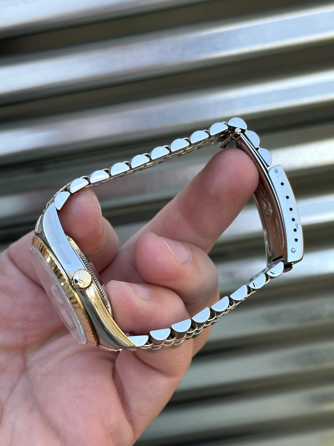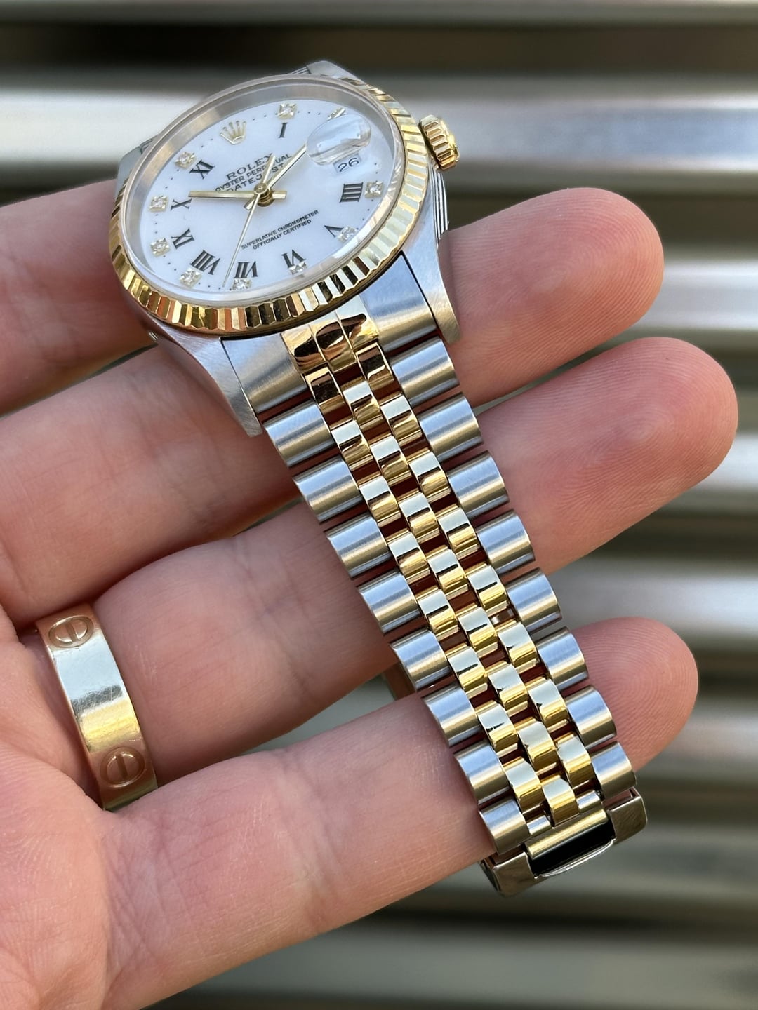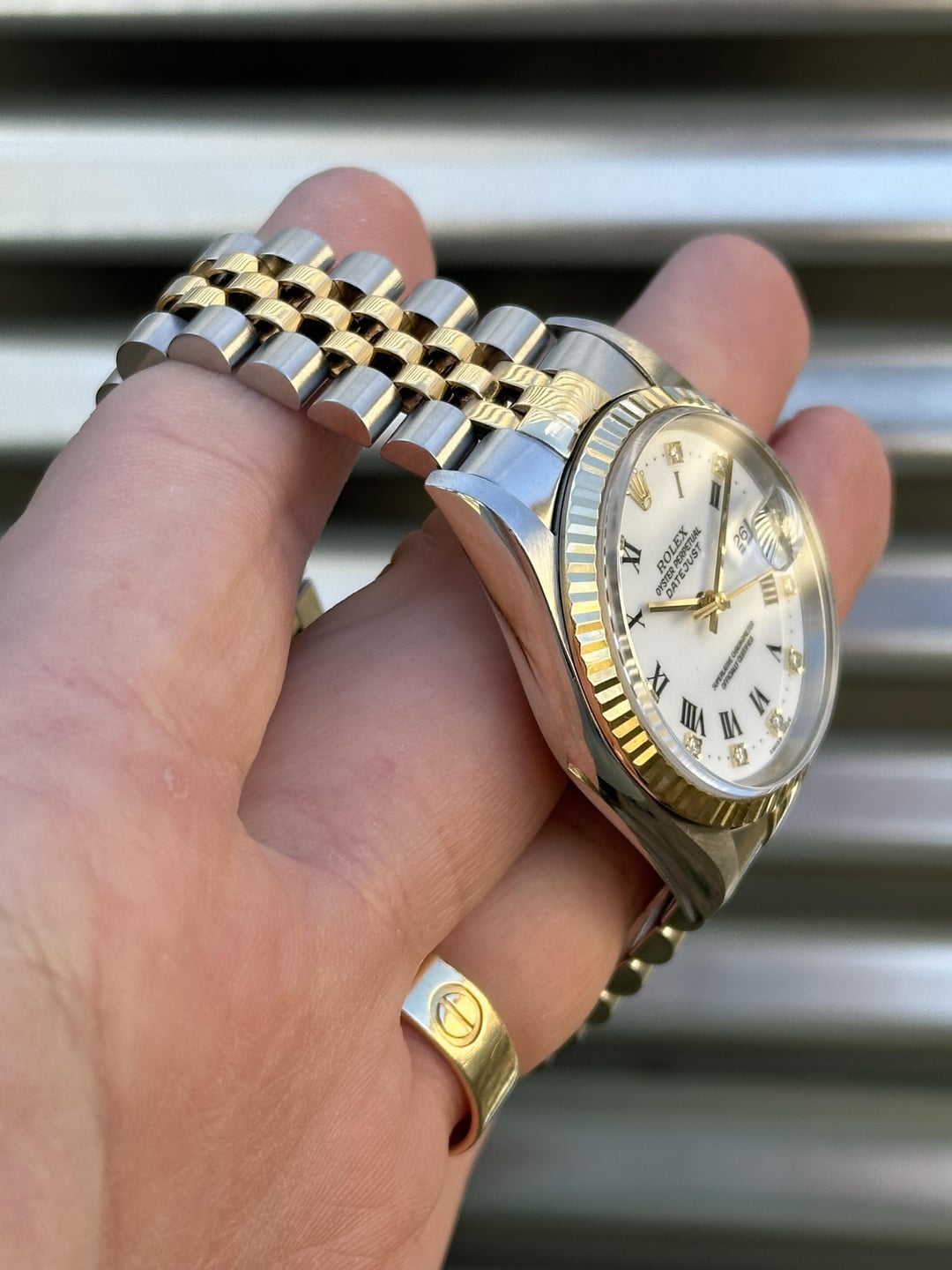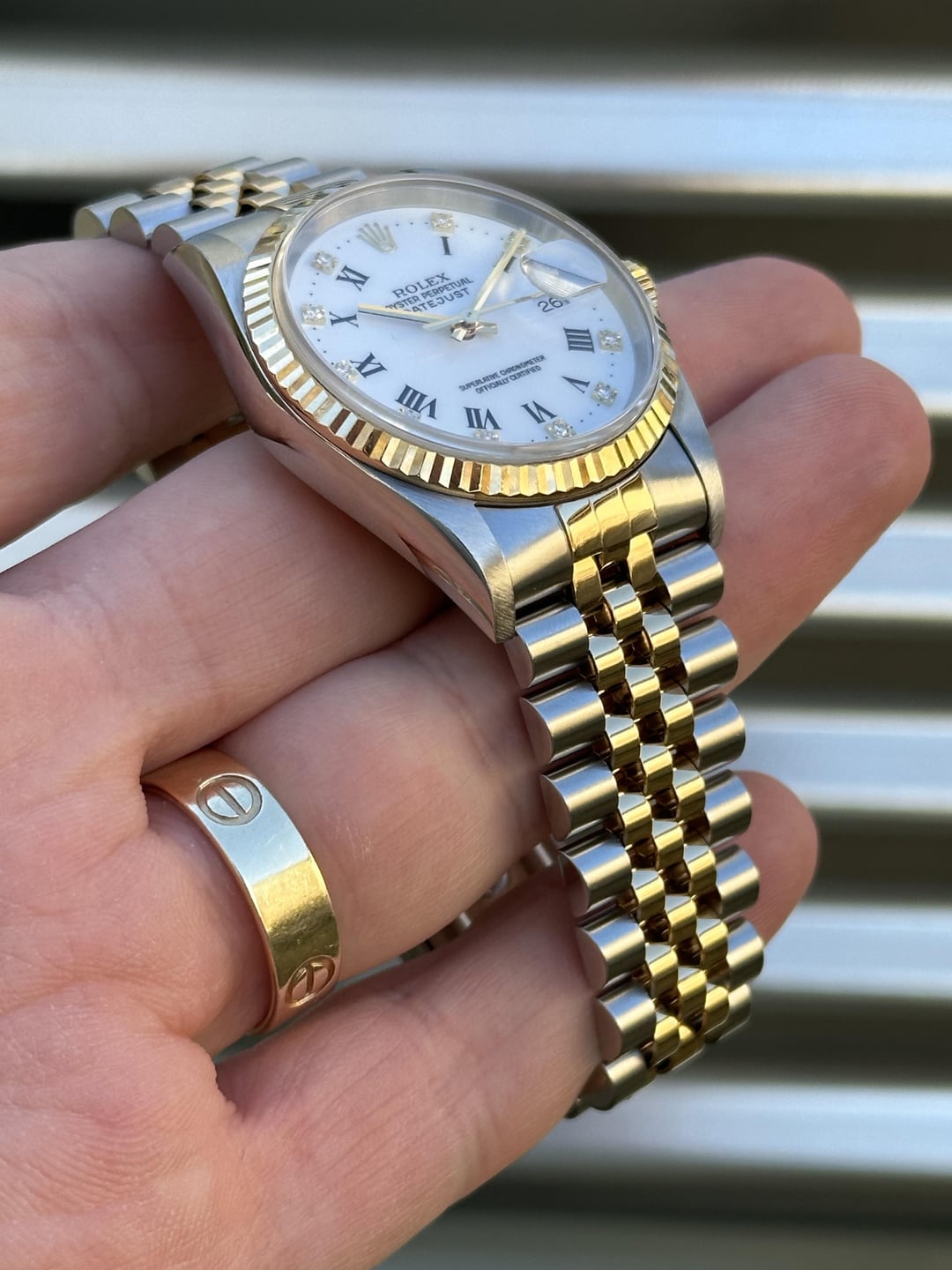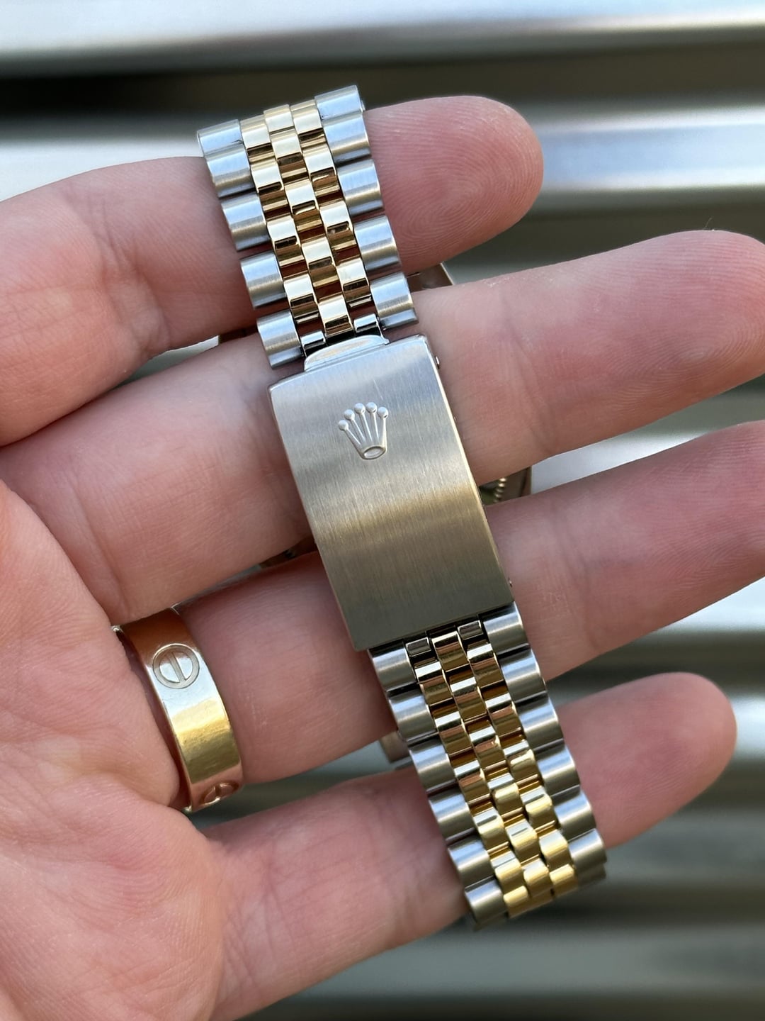 Here is a two-tone 36mm Rolex Datejust Reference 16233 with a unique White Roman Numeral dial with diamond indices. It features an 18k gold fluted bezel on a solid no-holes case with a jubilee bracelet. It comes complete with Box & Papers. Reference number: 16233 Serial number:  P***** serial which dates this watch to 2000 COMES with BOX & PAPERS, HAND TAG,Serialized tag, BOOKLETS, (see second picture for everything that’s included) 💰6️⃣8️⃣5️⃣0️⃣+✈️ The watch is in overall very good pre-owned condition - see pics for details. The case is super sharp, with nice sharp edges and thick lugs.The sapphire crystal is free of chips. The 18k yellow gold fluted bezel remains in good shape, free of any major dings or dents. Coronet on the clasp is well defined. Tight bracelet. Overall this is a nice set that’s suitable for a collector as well as someone looking for a clean daily! 20 links on bracelet Fits about 7.25inch wrist 💰6️⃣8️⃣5️⃣0️⃣+✈️ We accept Zelle/Wire as payment. Overnight fully insured shipping. I have plenty of references across different platforms so buy with confidence. Follow our ig @215Watches for daily deals. Thank you for your time [photo album](https://imgur.com/a/Lw3KX5U) [time stamp](https://imgur.com/a/4lFiAzx)