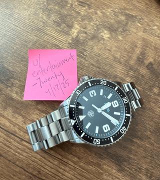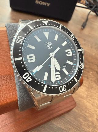 Up for a sale is a used Nth Swiftsure black dial with date. Sadly, Nth is out of business but [HERE](https://www.watchgecko.com/blogs/magazine/the-nth-swiftsure-review-sometimes-bigger-is-better) is a review of the watch along with specs. [Album including timestamp and videos](https://imgur.com/a/jQHtkxH) The watch is in good shape, especially for a tool watch which this certainly is. There are 2 tiny nicks that are barely visible only in harsh light and hairlines on the bracelet and clasp. Watch is currently sized for a 7 1/8” wrist but includes 2 additional full links and 2 half links and has 6 micro-adjustment spots on the clasp. Sale includes outer box and inner box. Asking $350 via PayPal F&F or Zelle and includes CONUS shipping. No trades. Please comment here before chatting or messaging. Thanks for looking!
