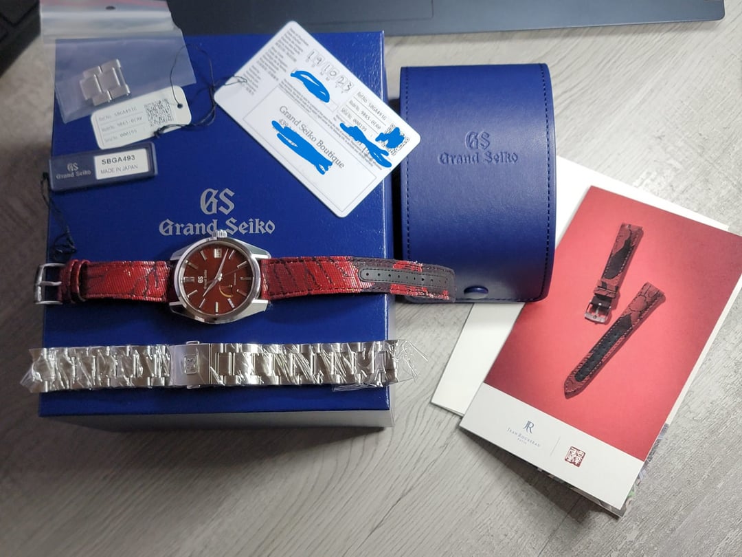 Grand Seiko Heritage Katana Red LE 500pcs Ref: SBGA493 This watch is in great shape with limited signs of wear throughout. Will come complete with double box, travel case, full unused bracelet, serial tags, extra JR red strap shown, and warranty card dated 10/19/2023. Price - $5599 shipped Pics & Timestamp = [https://imgur.com/a/hLsPWAV](https://imgur.com/a/hLsPWAV) IG = watchfornia Cheers, Adam