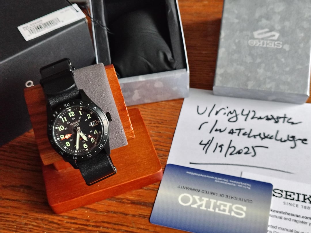 Selling a Seiko 5 GMT PVD - SSK025 - 39.4mm - 4R34 Full kit, 9.5/10 on OEM Leather NATO, double boxed with card and hang tag. Seiko no longer provides printed manuals for this watch. This sharp little field GMT is in excellent condition. $265 USD covers shipping in the US. PP FF or Zelle preferred Please comment before pming or chatting Thanks for looking!!