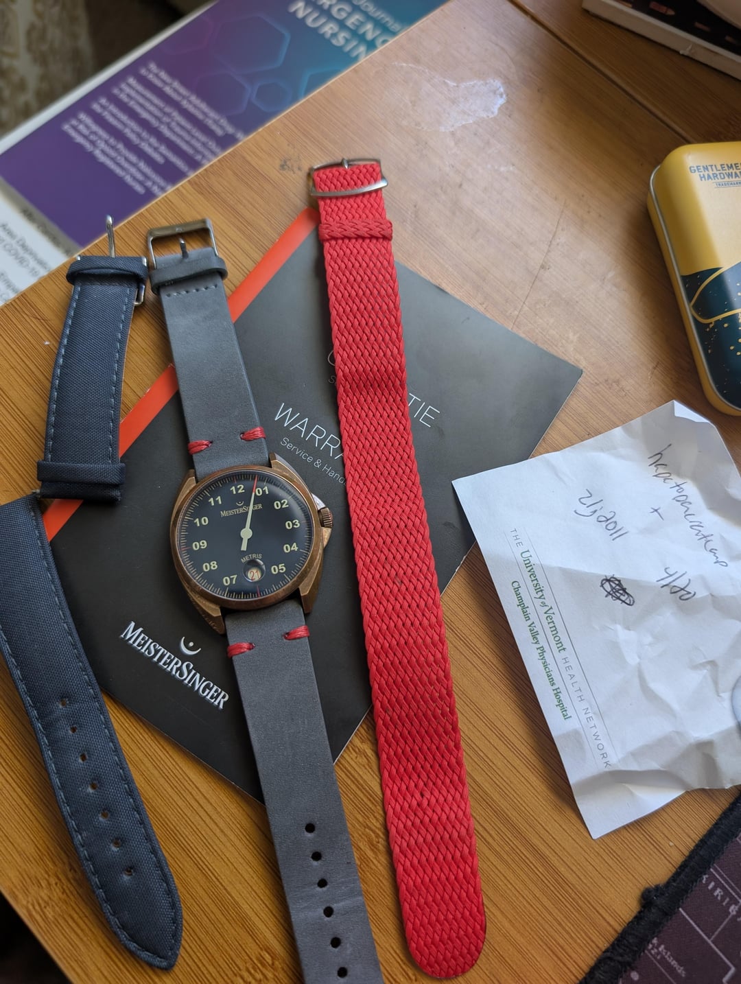 Reserved sale for /u/zlj2011 from this ISO post: https://www.reddit.com/r/Watchexchange/s/f7jplyKJpW) MeisterSinger Metris Bronze $700 via zelle/ppff Good condition, runs well. Keeps time as well as a 1 hand watch can! Comes with the warranty, and 3 straps. A fun weekend piece, I called it the "Ish-meister" because it's always "___ oclock-ish"! Just some of the fun features: Sapphire crystal Raised cyclops 200mm water Resistance Sw200 38mm bronze case Crown guards Screw down crown