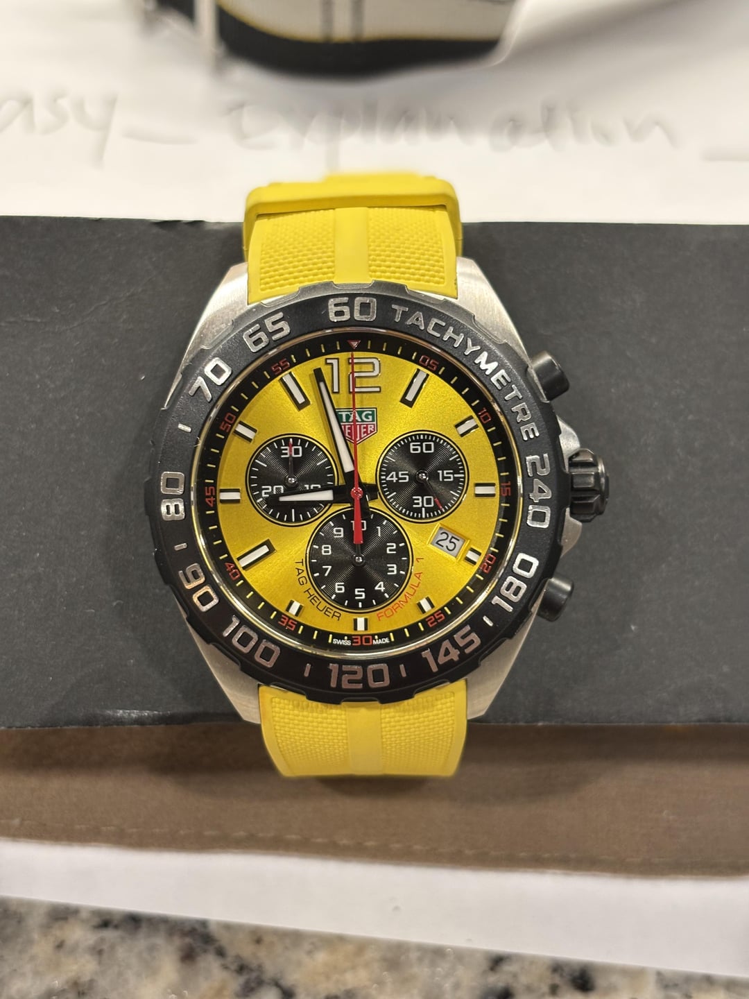 Good afternoon y’all, Interested in selling a used... Tag Heuer formula 1 CAZ101AM.FT8054 740 🚢 Timestamp: https://imgur.com/gallery/pNNYW4D Watch is in excellent shape. This Watch will be shipping from the great state of Texas. If you’d like to make an offer or have any questions feel free to reach out and thank yall for checking out the post 🙏 Description * Formula 1 Collection * 43mm Case Dimension * Stainless Steel & PVD * Featuring Quartz Movement with Chronograph & Date Complications * Fixed Bezel * Yellow Dial * Yellow Rubber Strap * Tang Buckle Details Estimated item measurements * Measurements: Fits a wrist size of 7.5” or smaller * ITEM DETAIL * Collection: Formula 1 * Model Name: Chronograph * Reference Number: CAZ101AM.FT8054 * Serial Number: BR***** * Movement: Quartz * Complications: Chronograph, Date * CASE * Case Shape: Round * Case Material: Stainless Steel * Case Diameter: 43mm * Watch Height: 13mm * Crystal: Sapphire * Bezel Style: Fixed * Bezel Material: Stainless Steel, PVD * DIAL