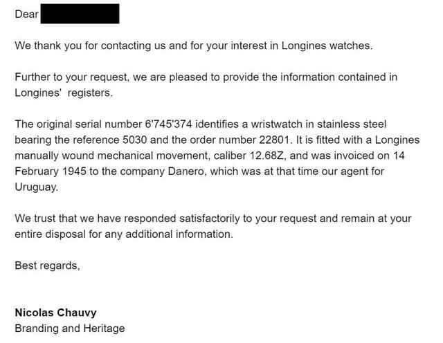 Up for sale is a 35mm steel Longines with a simple bauhaus-style dial. It’s a really nice, original piece, offered at a very fair price. Included is a digital copy of the Longines Extract from the Archives. Photos: https://imgur.com/a/2egOVMm Video: https://vimeo.com/1077007378 Timestamp: https://imgur.com/a/qTnWAZf Dial: Original, non-refinished white bauhaus-style dial features Roman numeral accents and is in nice condition. There are some marks on the dial but it remains attractive. Case: Original 35mm 4636 reference stainless steel case is in nice, unpolished condition. Case edges and brushing remain very sharp. There’s some wear on the caseback from a nato strap. Crown: Original, unsigned crown. Crystal: Crystal is free of scratches. Unsure if it’s the original as they weren’t signed. Movement: Original 12.68z movement runs, winds, and sets fine, however it is running slow so a service is recommended. Bracelet: Comes on the Soviet beads of rice bracelet pictures. Archive: Includes a digital copy of the Longines Extract from the Archives that indicates delivery to Italy in April 1943. See attached. Asking $750 shipped worldwide from the US. Bank transfer/Wise (or similar) preferred for payment. I have lots of reviews on Omega Forums. Returns are accepted if the watch is grossly misrepresented. Feel free to message me with any questions.