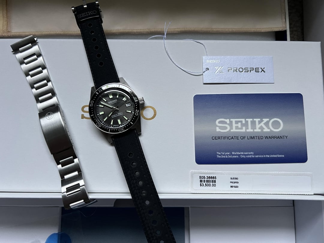 Hey all! Today I have a pretty sweet one! The foundation for Seiko’s dive watch legacy! This watch has been a fantastic companion, but a grail opportunity has come up. And with my strict one-in, one-out policy, this one needs to move on. If you’re interested, please comment “PM” before messaging! Condition: This SJE093 is in great condition. It is currently on its untouched factory strap and will also include a lightly used Uncle Straps (formerly Uncle Seiko) H-Link bracelet. The watch case is in excellent shape, with only minor signs of use: * Light marks on the lugs from strap/bracelet changes * A small mark on the caseback from the bracelet * Light desk marks on the bracelet clasp Movement is running strong with no issues! Please feel free to ask any questions! Wearability is excellent. It’s more compact and comfortable than earlier 62MAS reissues like the SPB143 or SLA017/9, and the finishing quality brings it as close to Grand Seiko as you can get! Timestamp + Album: https://imgur.com/a/iDngHEw Price: $3,400 * Shipping: Included for U.S. buyers. International shipping available at additional cost. * Payment: PayPal F&F or G&S (+4%), Zelle, or bank wire accepted. * Trades: Shoot me some offers! I am considering some Omega and Grand Seiko’s and others! You can also find me on Instagram at @rgxhermes.