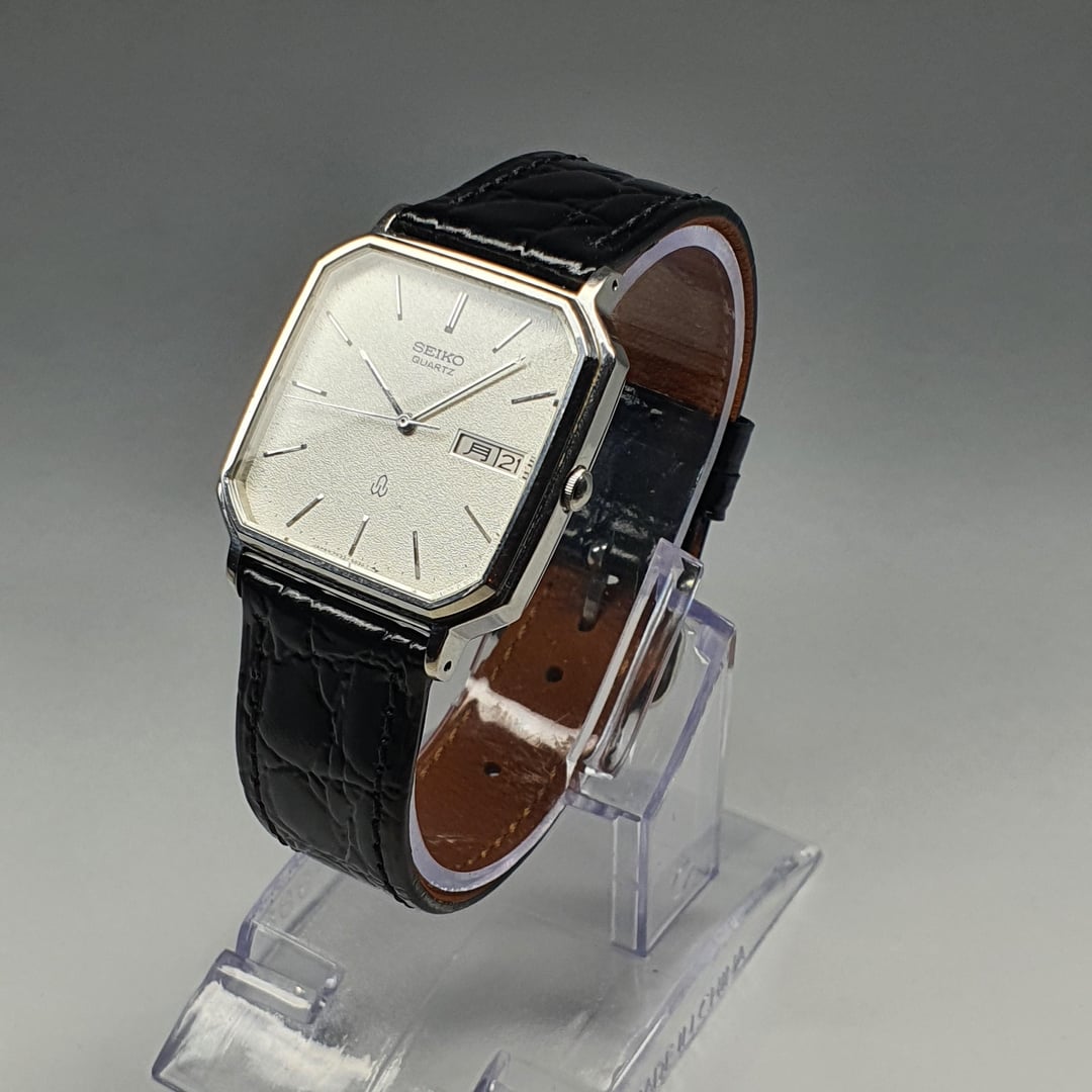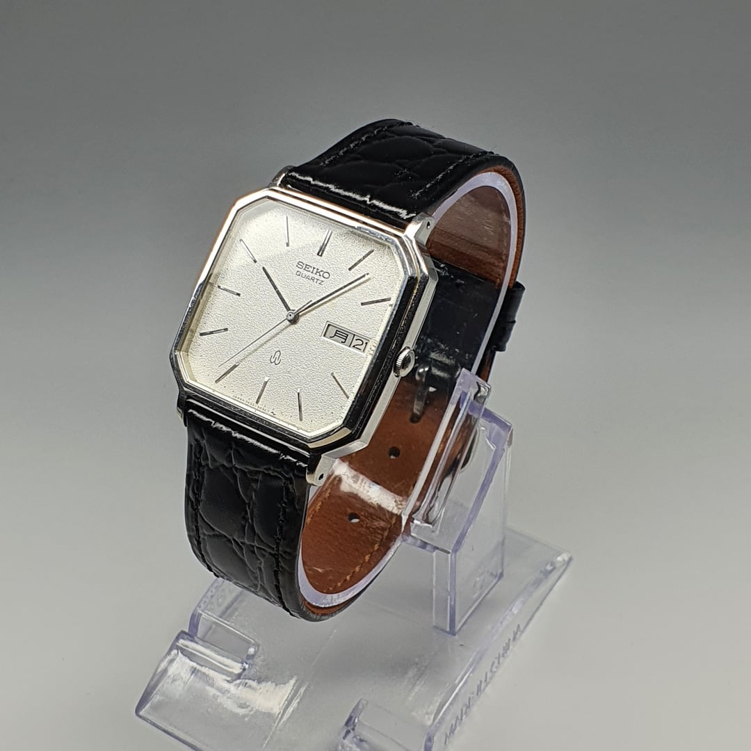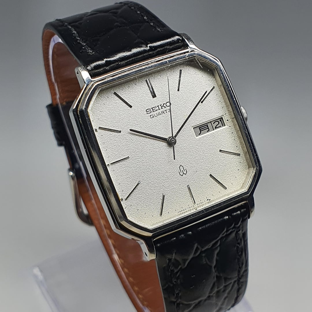 For sale is this vintage Seiko Single Crystal Quartz 7433-5020, made in Japan in August of 1983. This Seiko has very clean '80s design with crisp edges and an exquisite dial. The dial is the star of the show with a special texture mimicking fresh snow fall. Seiko is known for their amazing dials and this one does not disappoint. The sharp, high-polish hands and stick baton markers with a central bevel cut through the dial beautifully with elegance. The silver background days of the week are bilingual with either English or Japanese Kanji (all in black except Saturday in blue and Sunday in red). Combined with the date they sit nicely in a simple but defined in-set date window. The 7433 movement is beautiful and still holds the quality from when quartz was the cream of the crop. The design is by the Daini factory (indicated by the lightning bolt symbol at the bottom of the dial and on the case back) during their fierce rivalry with the Suwa factory. Brand new strap, very comfortable and malleable. Condition is very good for its age being a 42 year old watch, with minimal general wear as expected. Dimensions are: 30.4mm x 36.7mm x 8mm Lug Width 19mm Looking for $160 net (Buyer pays Paypal/invoice fee) International Tracked Shipping $10 More pics: [https://flic.kr/s/aHBqjC9VwV](https://flic.kr/s/aHBqjC9VwV) Bought in Japan. \*Returns accepted but all return postage costs are the buyer's responsibility in all circumstances.