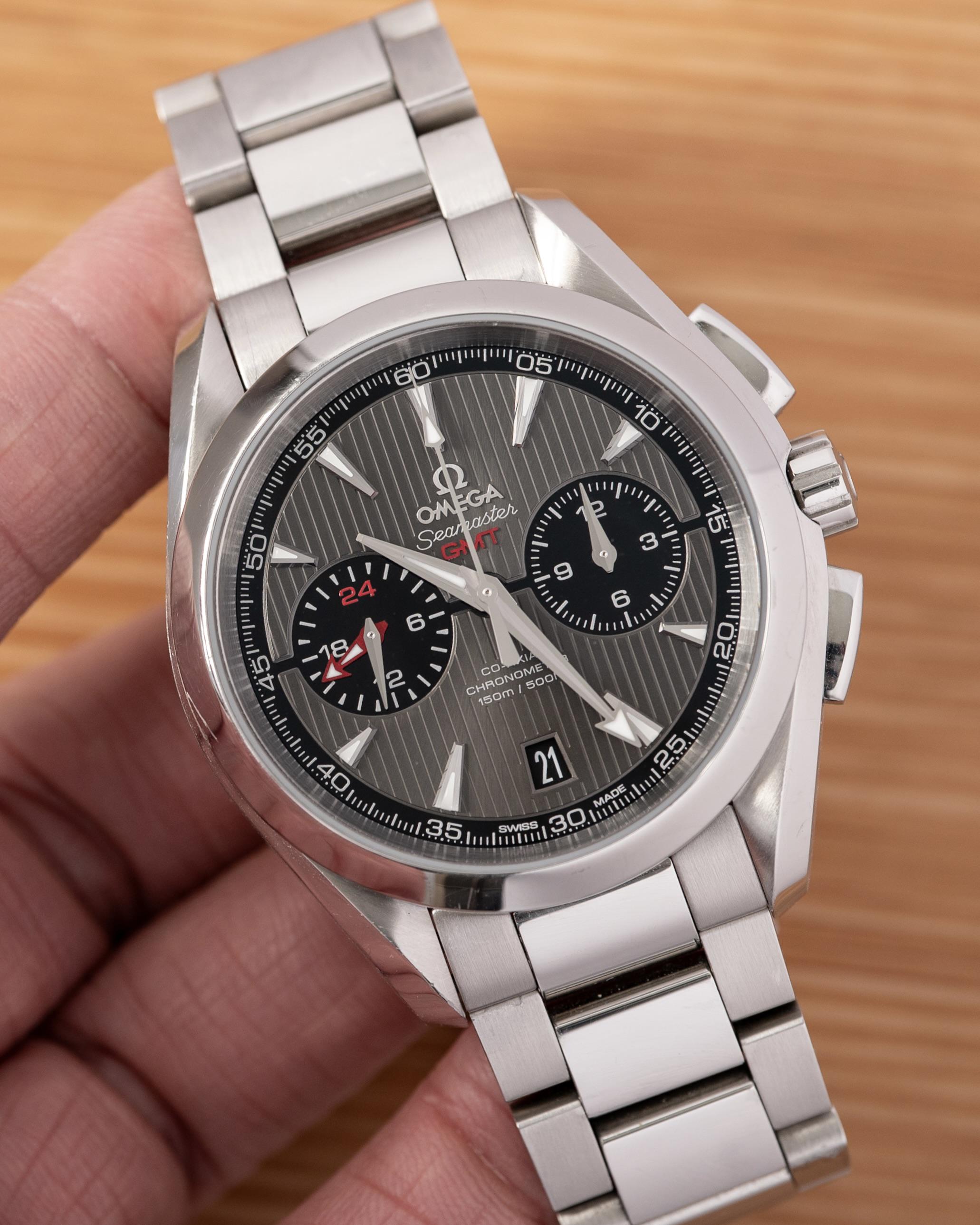 Up for sale is an Omega Seamaster Aqua Terra GMT Chronograph. This model features a dark grey dial with the Teak Concept pattern and black lacquered sub-dials. There is a small seconds sub-dial with a red aluminum GMT hand at 9 o'clock. This watch also features column wheel chronograph with sixty-minute and 12-hour counters which are found on the same dial at the 3 o’clock position, allowing for intuitive reading of the elapsed time. The main hour hand can be independently moved that also drives the date both forwards and backwards. No issues with the watch. The watch comes with inner and outer box, cloth pouch, manual, and pictogram. **Priced to sell at $3,750 shipped from Atlanta, GA.** **Lowest price for this reference anywhere online.** **For trade inquires, please send complete details of your offer outright.** **Timestamp and pictures:** [**https://imgur.com/a/u-cubex68-HDnosdI**](https://imgur.com/a/u-cubex68-HDnosdI) Reference: 231.10.43.52.06.001 Case material: Stainless steel Case size: 43mm Lug width: 21mm Dial: Black teak pattern Water resistance: 150m Movement: Omega co-axial chronometer 9605 Power reserve: 60 hours