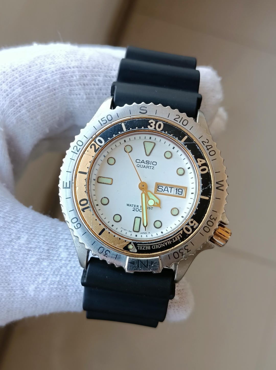 Casio Divers/Compass Bezel Watch. Model- MD-708, Year production 1980s. Description and Features: Overall this is in good Working condition. All original parts with good condition. Unidirectional rotating bezel with compass markings. Luminous hands and markers for enhanced visibility. Day/Date indicator. Glass Material: Mineral Crystal. Case material: Stainless steel. Strap after market resin strap. This is a vintage item so will show signs of wear please look at all the photos as they are part of the listing description. SPECIFICATIONS: Movement: Quartz, Case Diameter, 42 mm, Thickness 10 mm, Lug Width 22 mm, Lug to Lug 45 mm, Watch only. Please comment before messaging. Batteries are not allowed to be sent with the watches as per shipping policy. Payment Method: PayPal friends & family, Crypto, Payoneer & Binance Only. Shipping From FedEx Express Shipping. Price $120 Shipped. After payment confirmation the scheduled shipping time will be 2-3 working days.