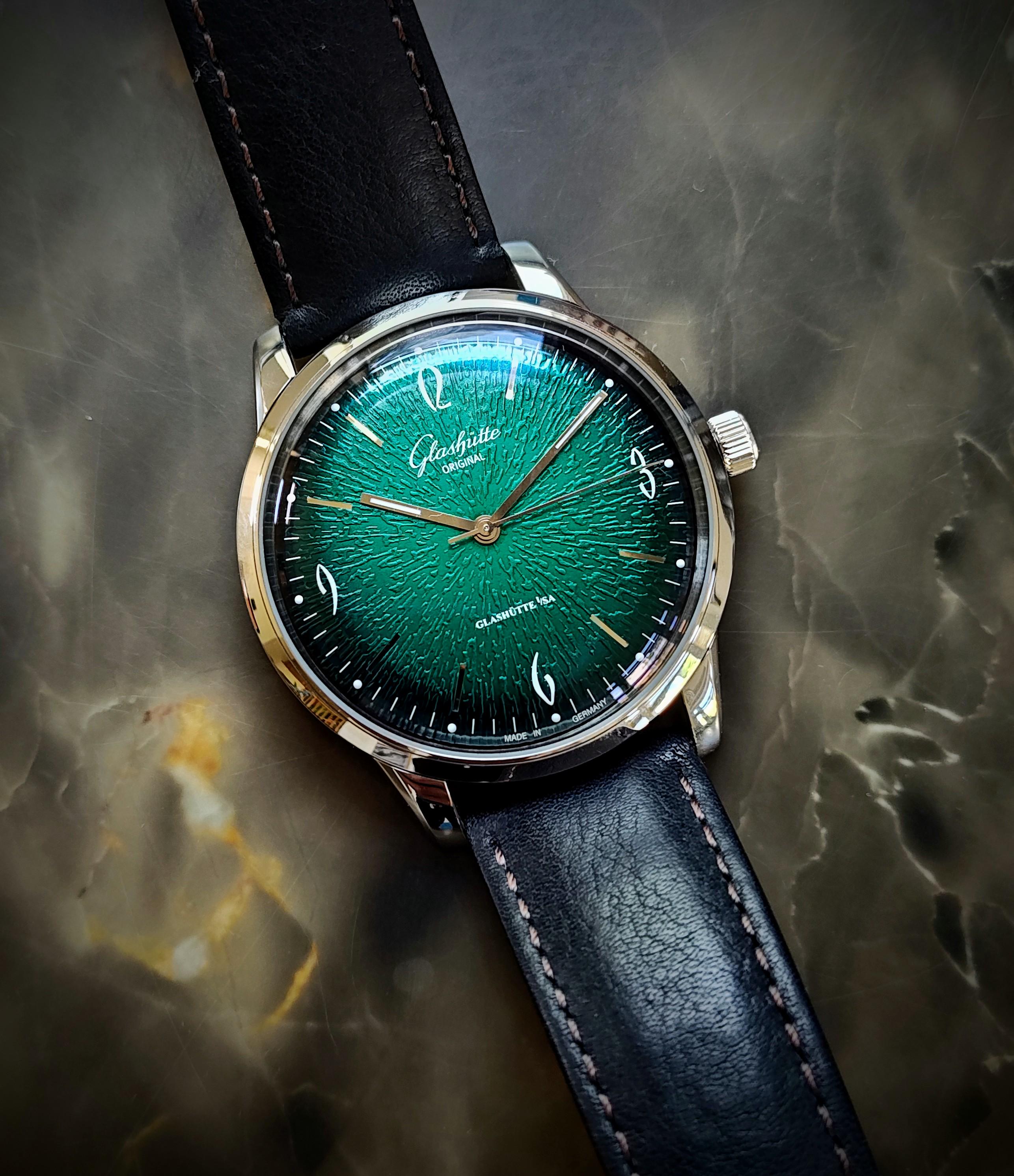 **Glashütte Original Sixties Varnished Green Dial** Distinct and striking green dial with dégradé effect pattern 39mm stainless steel case with black leather strap with factory buckle. Glashütte Original manufactured movement Caliber 39-52. Comes with boxes, booklets and stamped papers dated 2023. Excellent condition. Reference 1-39-52-03-02-04 More pics: [https://imgur.com/a/HaHnpu8](https://imgur.com/a/HaHnpu8) $4,600 plus shipping Watches are shipped fully insured with FedEx Express. Local pickup is available in Los Angeles area. Zelle, Venmo and wire accepted. Watch dealer with positive feedback on hundreds of successful transactions throughout watch community, including WUS, C24, eBay, FB. Thanks for looking. Check my 100+ 5-star reviews on Chrono24! Please see my other listings. I have a lot of cool watches listed and update inventory weekly.