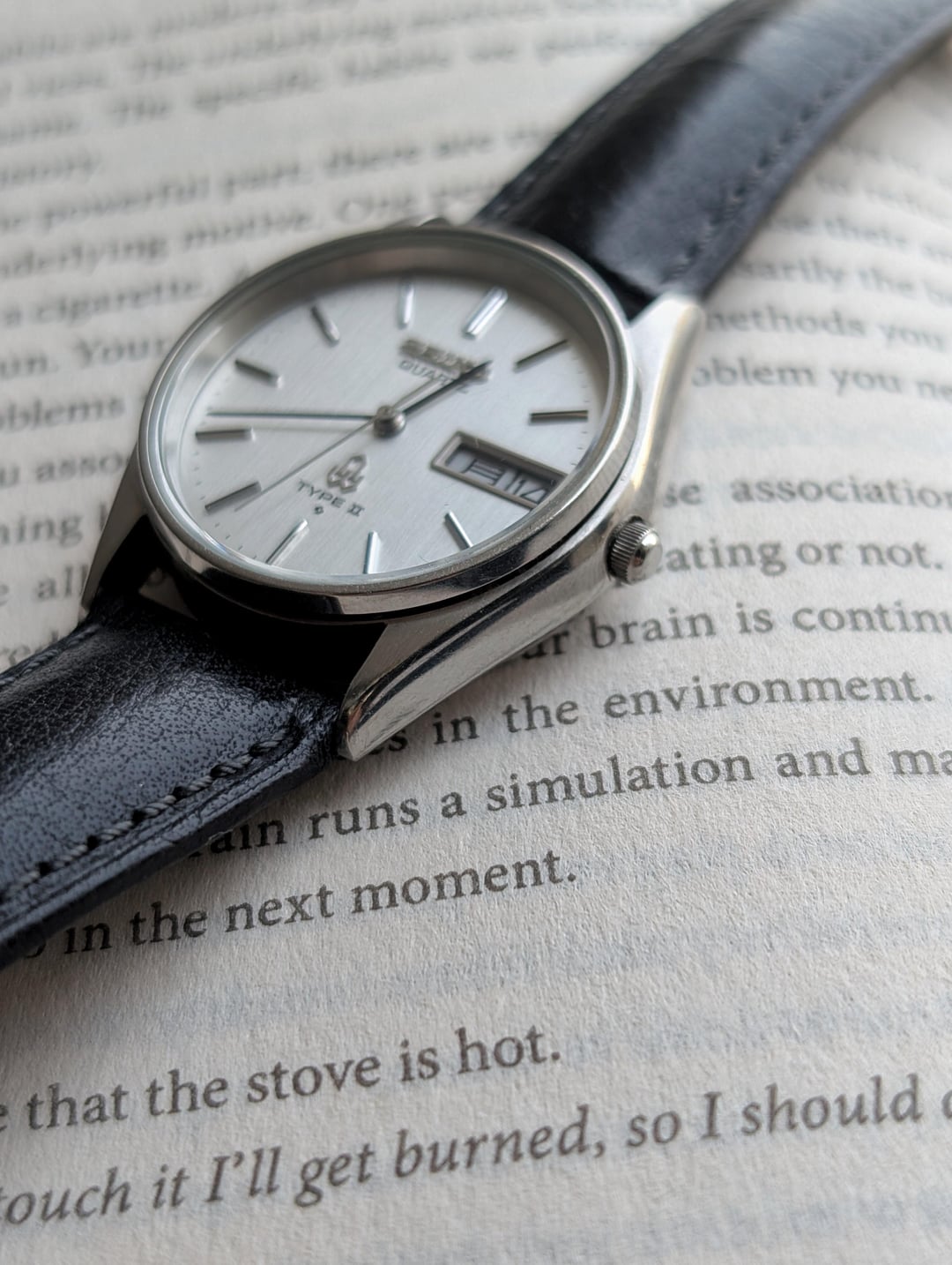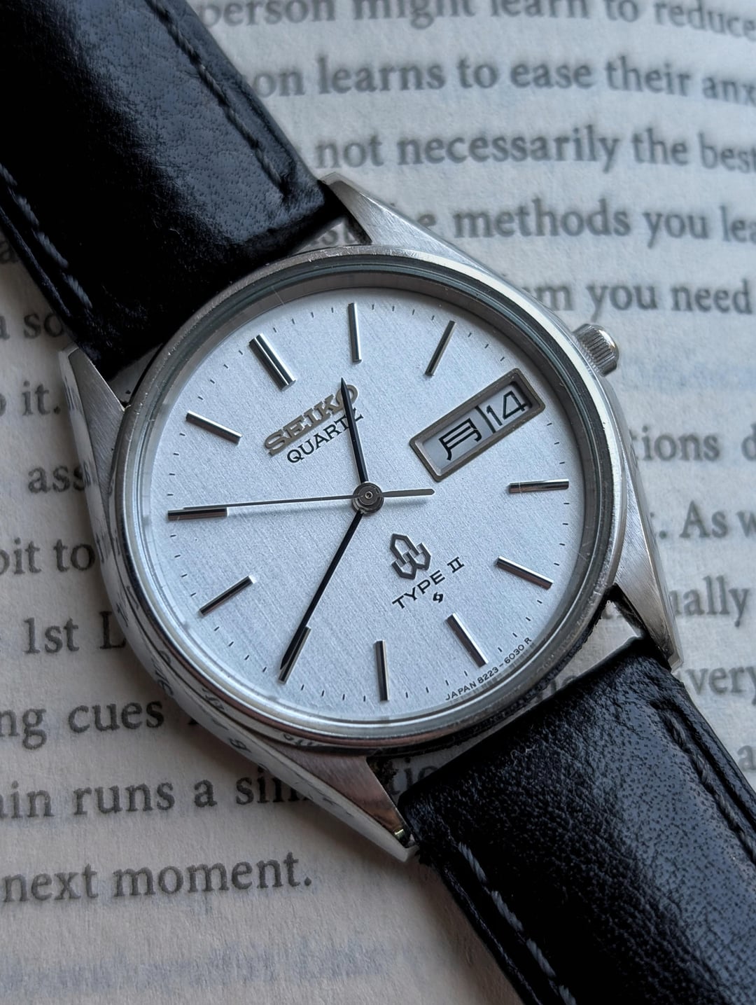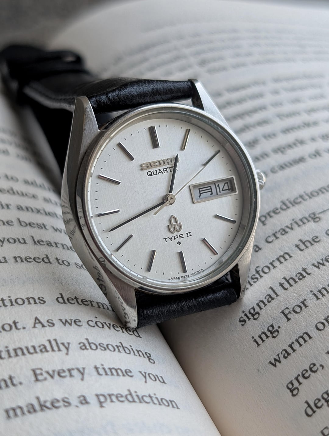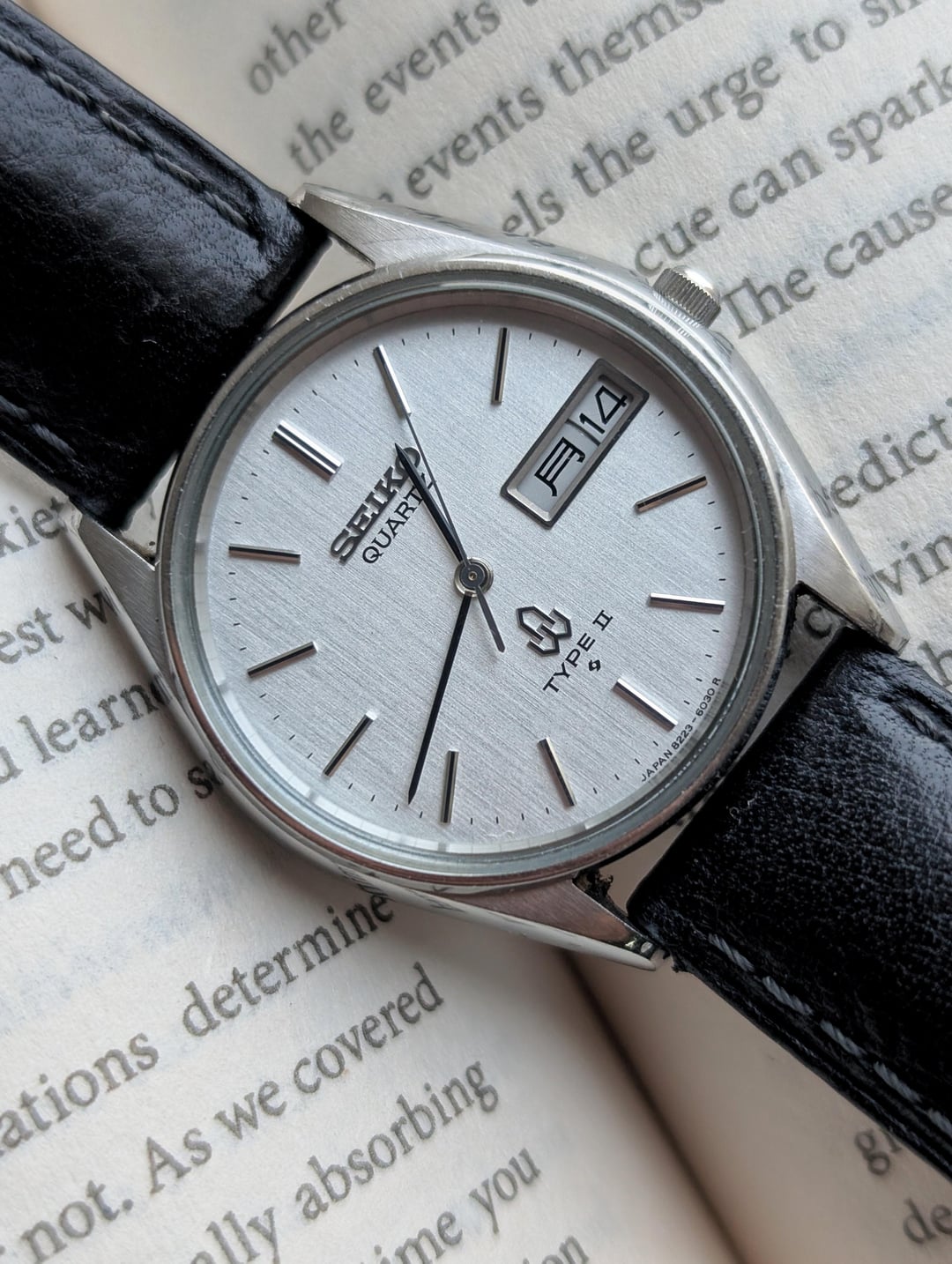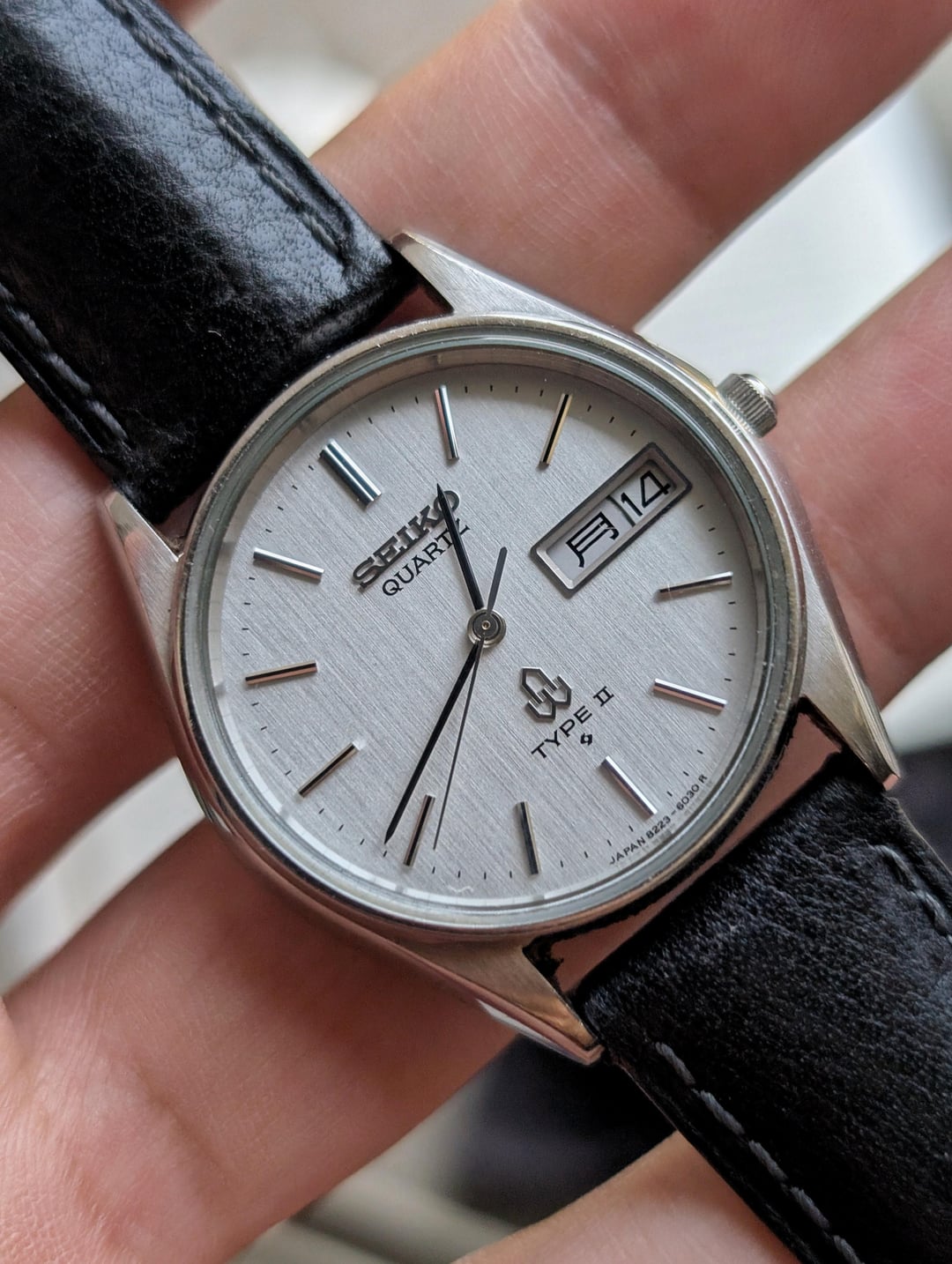 Greetings watchexchange! Up for sale is a beautiful vintage Seiko Type 2 Quartz from October of 1979, the watch features a stunning horizontally brushed white dial, applied indices and a 34mm stainless steel case with 18mm lugs, and an aftermarket Hirsch camelgrain leather strap. The watch is in beautiful condition, lightly polished and with very few marks on the crystal. The watch has a bilingual English/Japanese day/date display. For size reference, the watch is pictured on a 6.5" wrist. [Timestamp ](https://imgur.com/a/lJnWBlq) The watch is priced to sell at $149 paid via Zelle or Wise and shipped via UPS. Please allow 3 to 5 business days for me to ship the watch out after your payment. Be sure to reach out to me if you have any questions or require additional photographs or information, I entertain requests for custom timestamps. Thanks for looking!