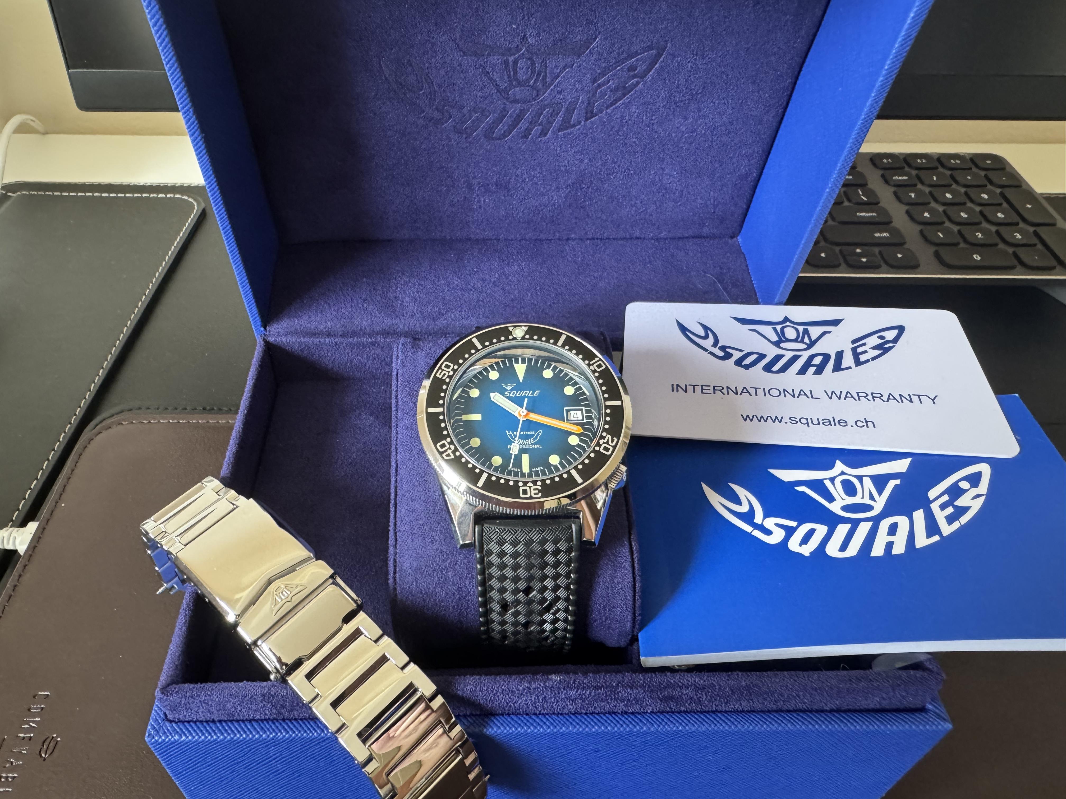 Hi! Summer is close... and this is a perfect watch for the summer! The **Squale 50 Atmos Profondo** is a true dive watch, combining robust construction with sleek design. With its stunning **blue ombré dial** and timeless dive watch aesthetic, this piece is built to stand out both underwater (500mt) and on land :) I purchased it in **February 2024**, and it still has the remainder of its **2-year warranty**. It's a complete package and I will include a OEM Squale steinless stell bracelet purchased few months later (as soon they became available - Sept. 2024). * **Condition:** Very Good! worn only occasionally. The bracelet was worn maybe couple of times. * **Price:** **700 USD** (including shipping - only US) * **Album:** [https://imgur.com/a/4z2uC5Z](https://imgur.com/a/4z2uC5Z) * **Timestamp:** [https://imgur.com/s5XV8H1](https://imgur.com/s5XV8H1) **What's included?** * Watch (1521 Blue Ray - ref: #1521PROFD.HT) * Original packaging and papers * Warranty card (valid until Feb 2026) * Squale Polished Stainless steel bracelet **Location:** NYC (available to meet in person) **Payment via:** Zelle, Venmo, or PayPal F&F P.S.: Not interested in trades at the moment. Feel free to message me with any questions or if you'd like additional pictures! Thanks for looking!