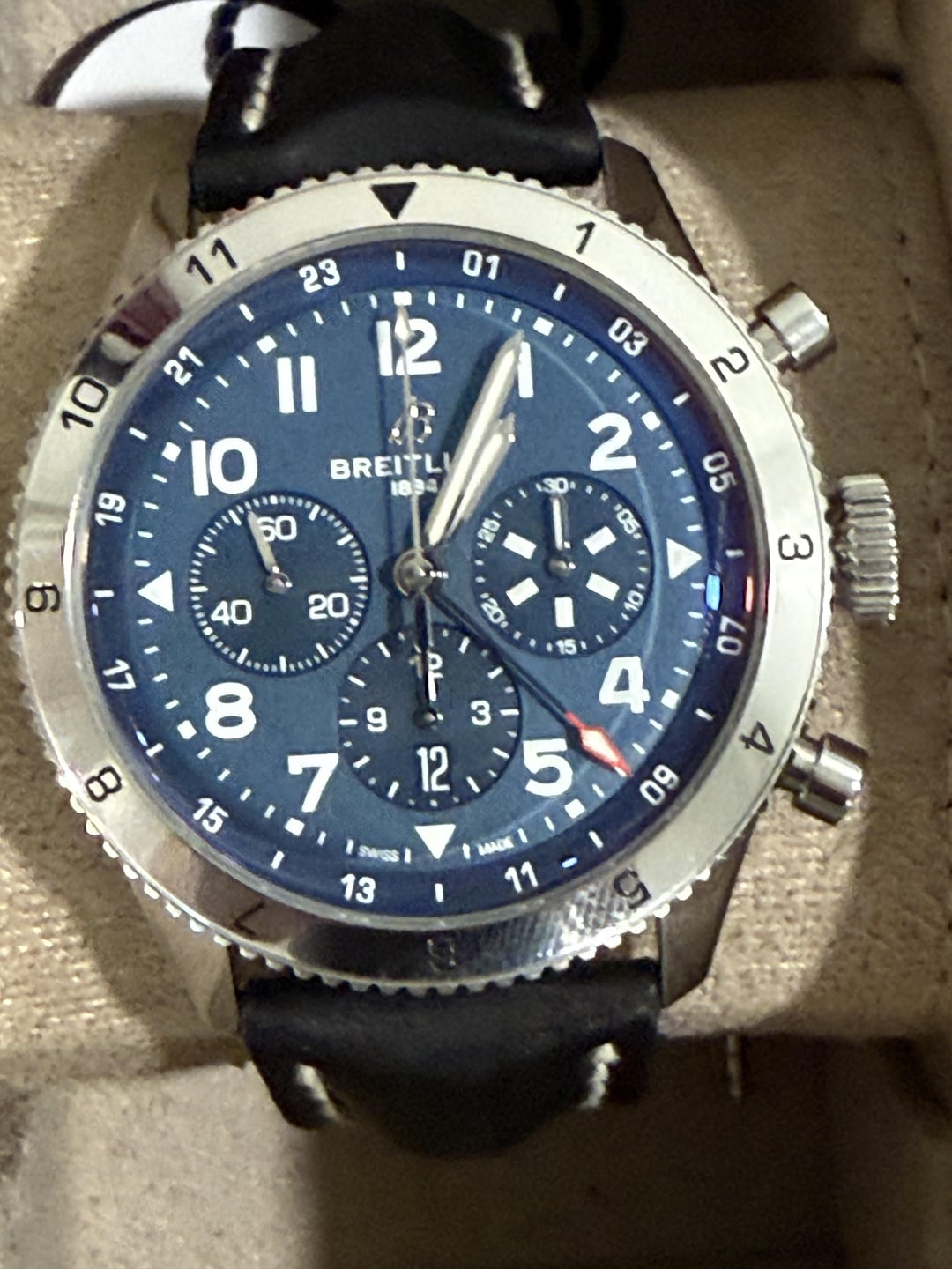 For Sale: Breitling Super AVI B04 Chronograph GMT 46 AB0445 Reference number: AB04451A1C1X1 MSRP: $10,800 46MM This is a ton of watch for the money. This Breitling Super AVI has both chronograph and GMT function. At 46MM it has a big presence on the wrists. This model is a tribute to the Vought F4U Corsair which is pretty interesting (https://www.breitling.com/us-en/watches/classic-avi/super-avi-b04-chronograph-gmt-46/AB04451A1C1X1/) which can be read on their page. It comes as a full set with box, warranty card, booklet and hang tag. Its under manufactures warranty until 8/2027. The watch is in excellent condition showing very little wear on case. The dial and crystal are clean. The strap is in good condition but showing some light use. I also have a Breitling bracelet that fits this watch that can be added to sale if desired (will fit 7” wrist). Asking $4450+label in US I have references across multiple platforms that can be provided. Please reach out with any questions or for more photos. Timestamp as last photo