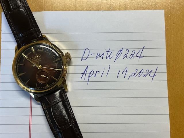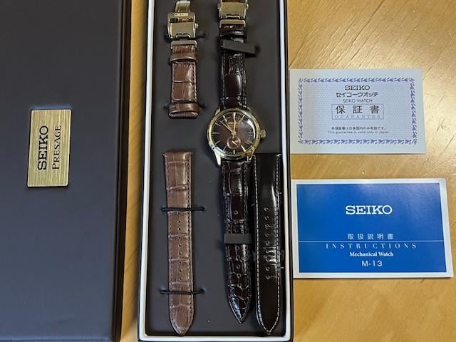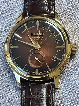 Selling my Seiko Presage Cocktail Time Old Fashioned, LE. I purchased it in January, 2024 from an online Japan store for $600, plus shipping. I intended to wear it for special occasions, but I have too many watches now. It is equipped with Japanese automatic movement and 4R57 calibre. It also has a power reserve indicator on the dial, so you will know when and how much to wind it. Other details: Seiko Presage Cocktail Time – Old Fashioned Gender Men's Movement Automatic, Calibre 4R57 Case Material Stainless Steel, Gold Plated Case Shape Round Case Size 40.5 Case Thickness 14.4 Dial Type Analog Dial Color Brown Band Material Leather Band Color Brown Water Resistance 50 Glass Hardlex Features Antimagnetic, Date, Power Reserve Indicator, Limited Edition The watch is in mint condition and I do not see any scratches on the case or the crystal. It will come as full kit, with blank guarantee card. It will also come with the 3 original Seiko leather straps and 2 Seiko deployant clasps. I am asking for $400 OBRO, which will include shipping to CONUS. I accept PP F&F, Venmo, or Zelle. Please add 4.5% if using PP G&S. Please let me know if you have any questions. Please comment on this thread before sending a chat.