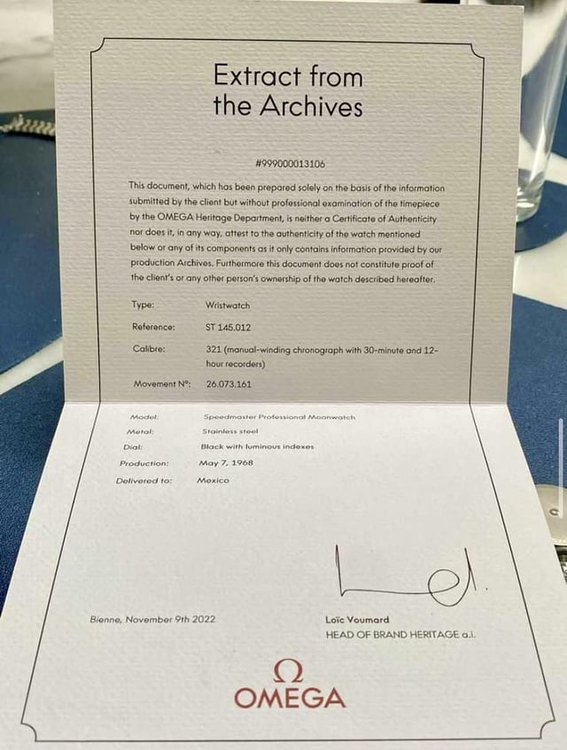 Omega speedmaster professional 145.012-67 caliber 321 with an exhibition caseback. Recent service last year and original box included. Extract of the archives comes also. The bezel is the correct DON(Dot over ninety) and it has aged to a beautifully faded grey which makes the watch more of a stunner and even more rare with this patina. Not many with a bezel that’s just as amazing as this one. The dial has aged gracefully with great patina also. Watch had a recent service last year $875 Watch comes with Omega extract of the archives and was delivered to Mexico for the Olympics of 1968. Movement Serial number matches that of the watch in the omega extract. Comes with what I believe is the original 1968 Olympic box. Caseback matches the Reference number as well 145.012- 67 as per picture. Watch Comes only with a flat link uncle seiko bracelet. Price $6450 Pictures: https://imgur.com/a/TRdZKQ3 Timestamp: https://imgur.com/a/qkTBvun