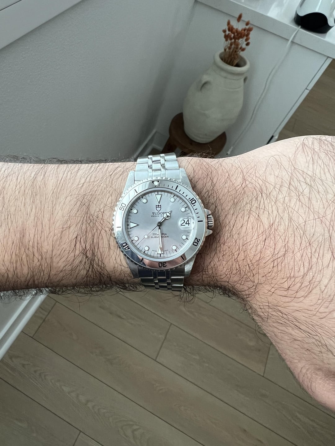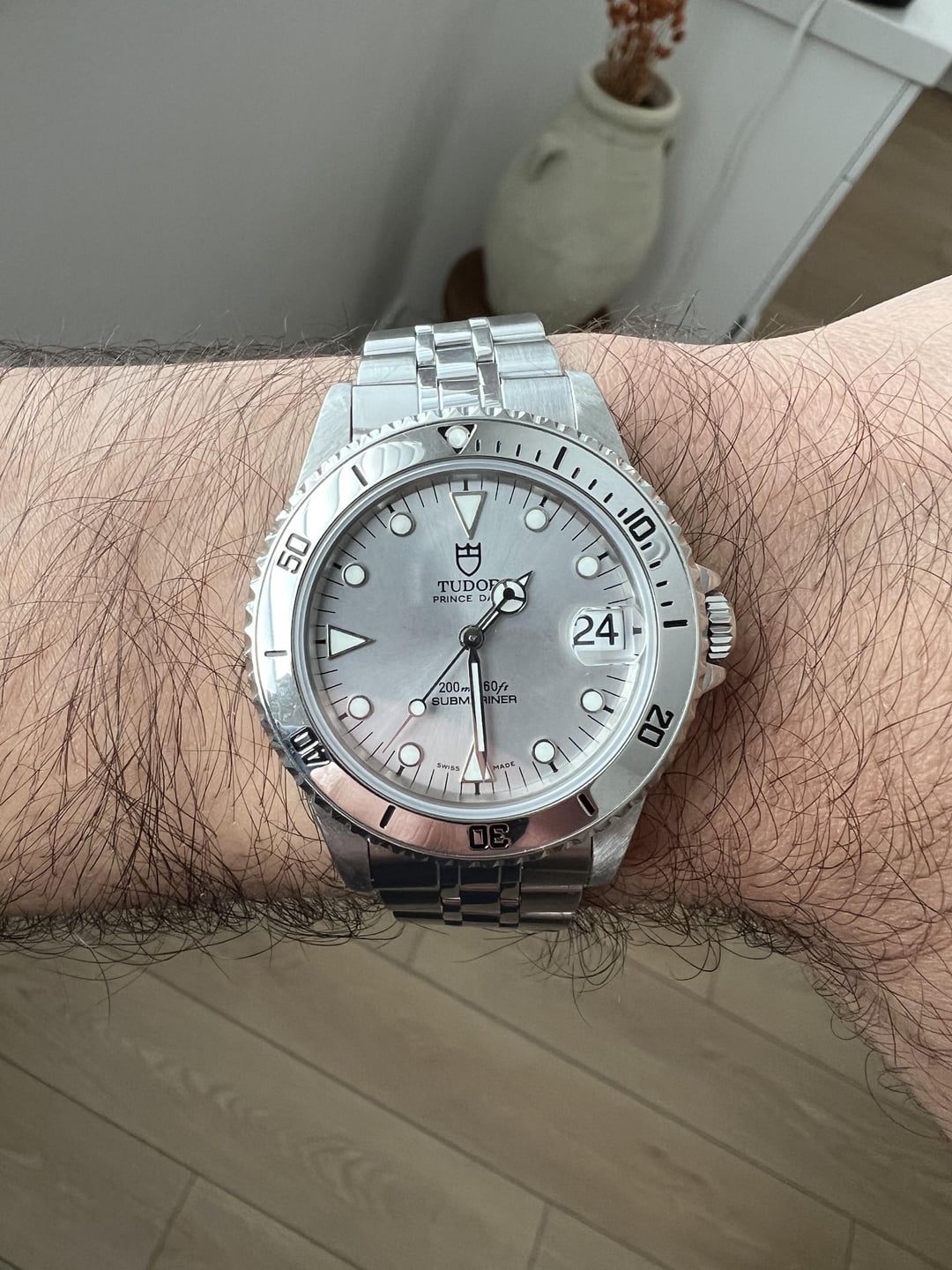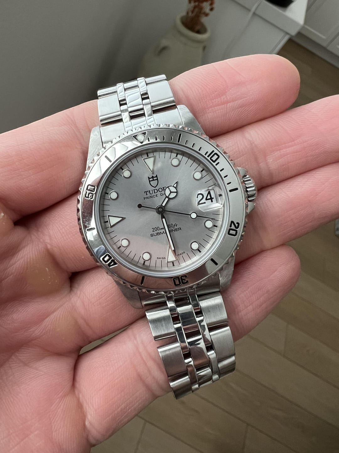 Up for sale is my Tudor Submariner (ref. 75190) circa 1998. This was a last reference model of the mid-sized Tudor Submariner. This one is 36mm and an incredibly capable diver with mid-sized proportions. This is the very rare silver dial/steel bezel combo. Selling now to fund a different purchase. This is a watch + box and papers set. I have the original box, papers, and booklets. The watch is in excellent neo-vintage condition. The watch is all original (dial, hands, bezel, insert, date wheel). The dial is in perfect condition - no blemishes and in original, untouched condition. The lume glows bright green and is still strong. There is a slight crack in the covering of the pip. This is not major and the pip is not in danger of coming out. The case is extremely sharp, thick, and even. The spring bars sit well below the lug holes and the crown guards are extremely strong. I am looking for a straight sale, no trades at this time. Price is $3,700 net to me (buyer pays shipping). Shipping via insured USPS in the CONUS. Payment via wire/Zelle, PayPal F&F, PayPal G&S (buyer pays fees). I can FaceTime you with the watch or take calls. Located in SoCal and could do a face-to-face deal potentially. Timestamp is the last photo!