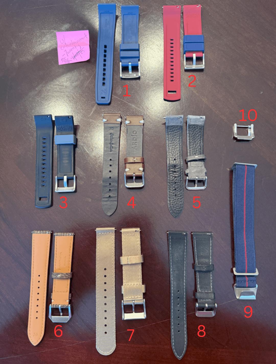 Looking to get rid of some straps that I don’t use or have never used. \#1 – [22mm Zealande Universal Straight Rubber Strap](https://zealande.com/products/22mm-straight-rubber-strap?variant=43489567047938) (ZBC08 with buckle and ZBC08L with holes). Condition is like new. MSRP is $169. Asking $125. \#2 – 22mm Barton silicone with blue top and red bottom. I think it’s [THIS](https://www.bartonwatchbands.com/products/navy-blue-top-crimson-red-bottom-elite-silicone?variant=21229202505782) one. Condition is like new. Asking $10. \#3 – 20mm Barton silicone with gray top and black bottom. I think it’s THIS one. Condition of the strap is good but the corner of the loop is starting to tear. Asking $5 but if you buy one of the other straps and want this one, I’ll throw it in for free. \#4 – [20mm brown Italian leather strap that comes with the Ardio Caribe](https://ardiowatches.com/products/caribe-gauge-brass). I have the beads of rice bracelet and another rubber strap I wear with the Caribe. This brown strap is in like new condition. Asking $25. \#5 – 20mm custom gray suede strap by TunsLeather. I believe it’s [THIS](https://www.etsy.com/listing/1107848227/nubuck-gray-watch-strap?ga_search_query=gray&ref=shop_items_search_34&pro=1&frs=1&sts=1&logging_key=728f1caed22d4ba700ab6003d715dfbc9cf49cc5%3A1107848227) one. Condition is pretty good but does have a slight crease on the second tightest hole (visible in the photo). MSRP is $50. Asking $25. \#6 – 20mm handmade DutchDesign strap. Condition is like new. Asking $40. \#7 – [20mm Vaer khaki nylon strap](https://www.vaerwatches.com/products/quick-release-nylon-watch-strap?variant=31401041232006). Condition is like new. Asking $15. \#8 – 20mm ZuluDiver canvas (or nylon?) stitched strap. Condition is like new. Asking $15. \#9 – 20mm elastic single pass nato strap. Might be a ZuluDiver? Not sure. Asking $10. \#10 – 16mm buckle, brand unknown. $10. Want to buy multiple? Let’s make a deal! Add $5 flat-rate for shipping no matter how many straps you buy. Accept payment via PayPal F&F or Zelle. Only CONUS shipping. Thanks for looking!