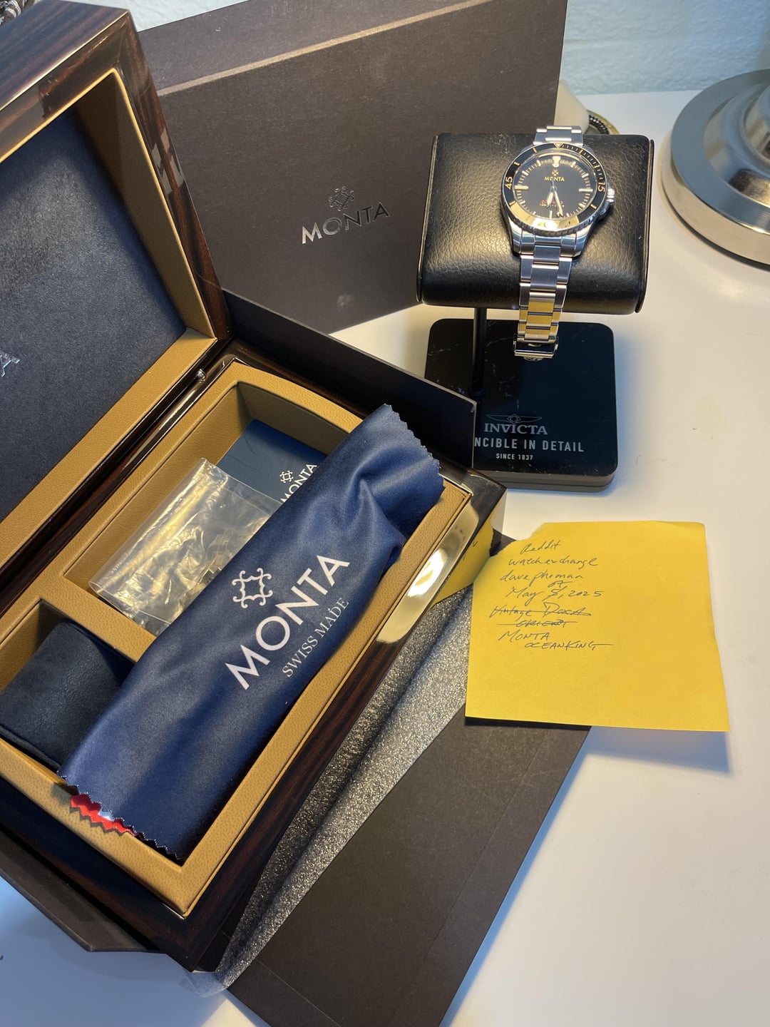 Hello everyone, Up for grabs is my Monta OceanKing V2, black dial, gilt. By far one of the most comfortable diver I’ve ever owned and experienced. I believe only 100 of these were ever made and even lower in this configuration. Condition is very good. Micro scratches throughout the watch from daily wear (in rotation). Some scratches on the bracelet and clasp and some very minor on the case. There are no “gouges” or any dings/dents. Crystal is perfect. I took pictures in direct sunlight to dramatically showcase the wear. If you would like more pictures, please let me know. Comes with everything you see. Currently sized for my 19cm wrist (I wear mine a little loose), with 3 extra links. Asking **$1500** shipped within the USA. Located in SoCal. Payment via Zelle, Venmo, and PayPal (at my discretion)