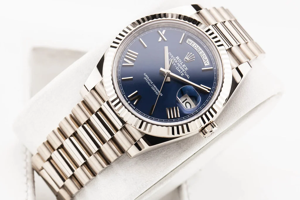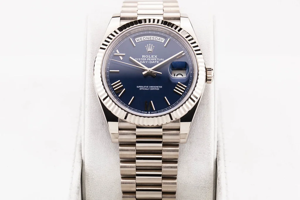 Up for sale is an excellent condition Rolex Day-Date 40mm White Gold Blue Dial with Fluted Bezel on President Bracelet, reference # 228239 It comes complete with all boxes, papers, booklets, hang tags, and Rolex Warranty Card dated June 2020.