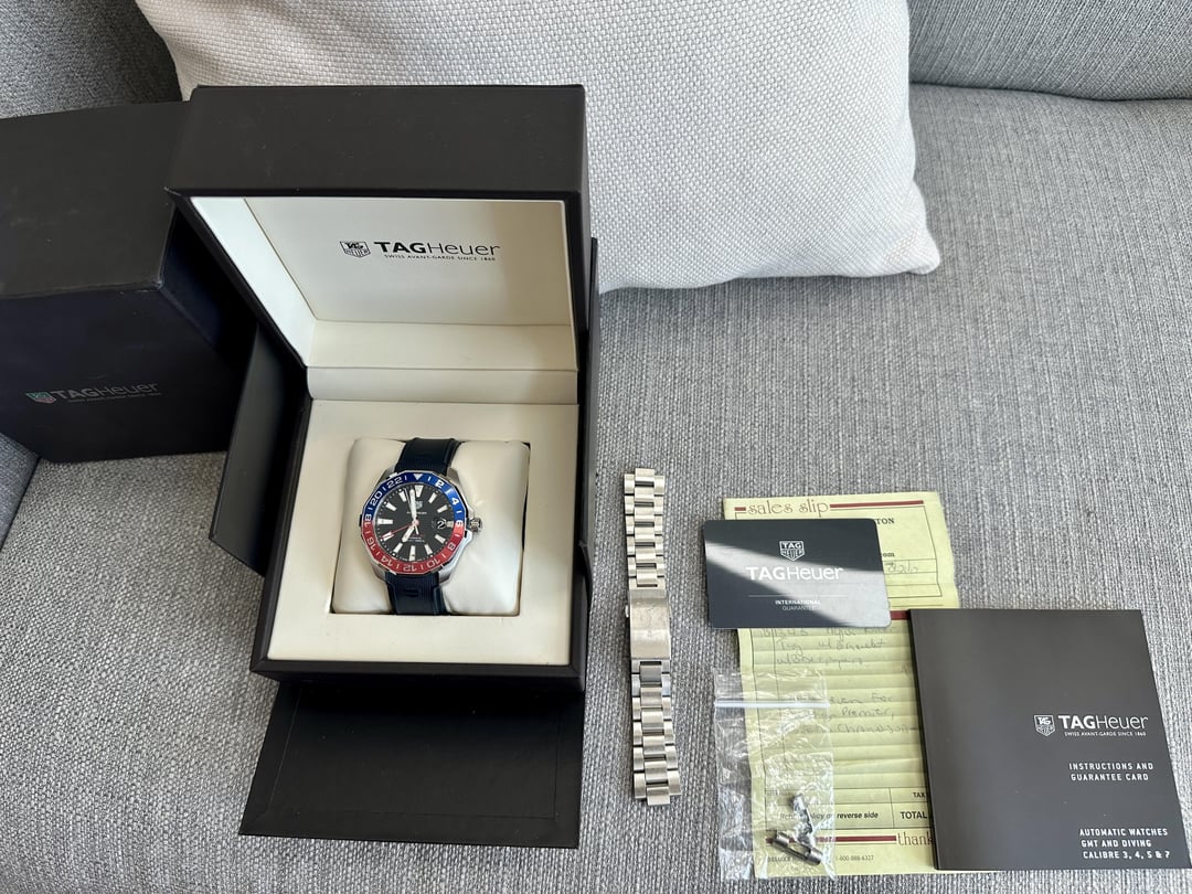 Hey guys, selling my Tag Heuer because I need funds elsewhere. Please comment before sending a DM. Prices include shipping, Zelle or wire is the preferred method of payment. Please add 3% if using Paypal G&S, but seller discretion if using Paypal. Please shoot me an offer if you don't like the price, unless marked firm. No trades please, I'm a passionate hobbyist and not a dealer. CONUS shipping preferred, extra cost for international, $100 discount per item for local pickup near Denver, CO 80126. I have 45 transactions here and my feedback on eBay under the same username (suskompany), is 2,200 and 100% positive. Also, check me out on Watchuseek where I have lots of positive feedback under the same username (suskompany). Message me on any platform for verification if you like. *Tag Heuer Aquaracer GMT in Red/Blue | Bracelet + Rubber | Full Set* \- **$1,825** **~~$2,500~~** **~~$2,950~~** * [Photos](https://imgur.com/a/rruhnte) * [Timestamp](https://imgur.com/a/gL41xoA) * Reference Number: WAY201F.BA0927. **No trades please, apologies!** * Good/Great condition, no issues mechanically. Cosmetically it does have some scratches and scuffs on the case/bezel but mostly on the bracelet. Please check the pictures. * Complete full set-- includes all boxes, all paperwork (including original sales slip), and the Tag Heuer warranty card. * In addition to the OEM bracelet, also includes the OEM rubber strap from Tag Heuer. Thanks for looking!