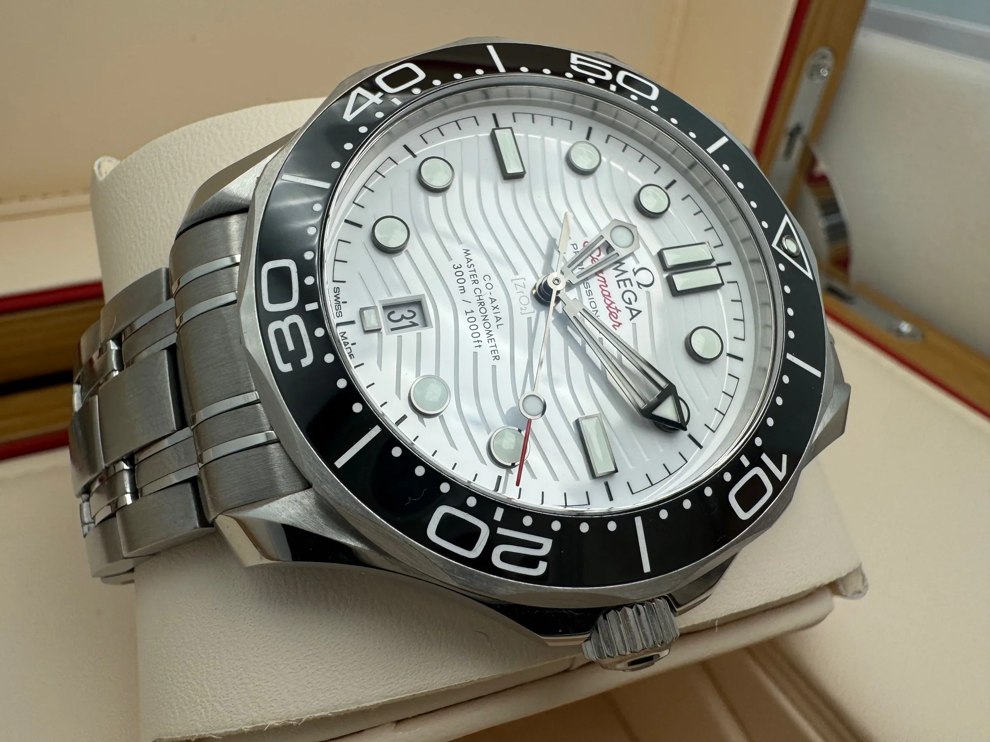 The watch features a 42 mm stainless steel case with black ceramic bezel / white enamel diving scale. The dial is polished white ceramic and features laser-engraved waves. The watch is presented on a polished-brushed stainless steel bracelet (foldover clasp with comfort setting and diver extension) and is driven by the OMEGA Master Chronometer Calibre 8800, which can be seen through the sapphire-crystal on the wave-edged caseback.