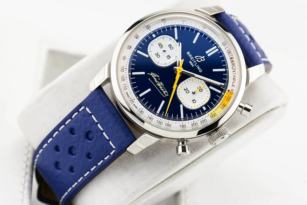 Up for sale is an unworn condition Breitling Top Time B01 Gino Bartali 41mm Blue Dial on Leather Strap, reference # AB01767A1C1X1. It comes complete with all boxes, papers, booklet, hang tag and Breitling Warranty Card dated May 2025. One of 750 pieces.