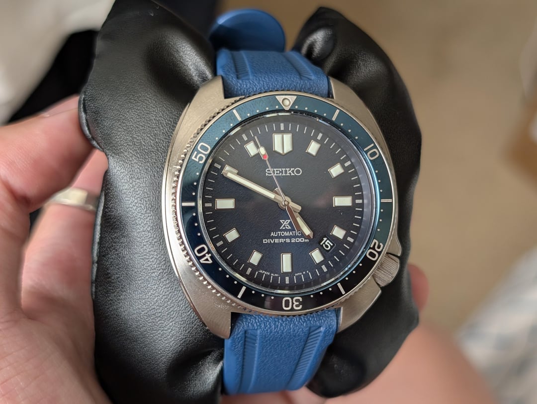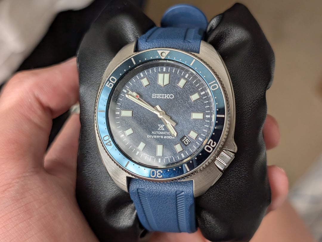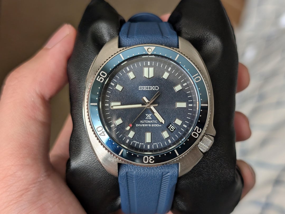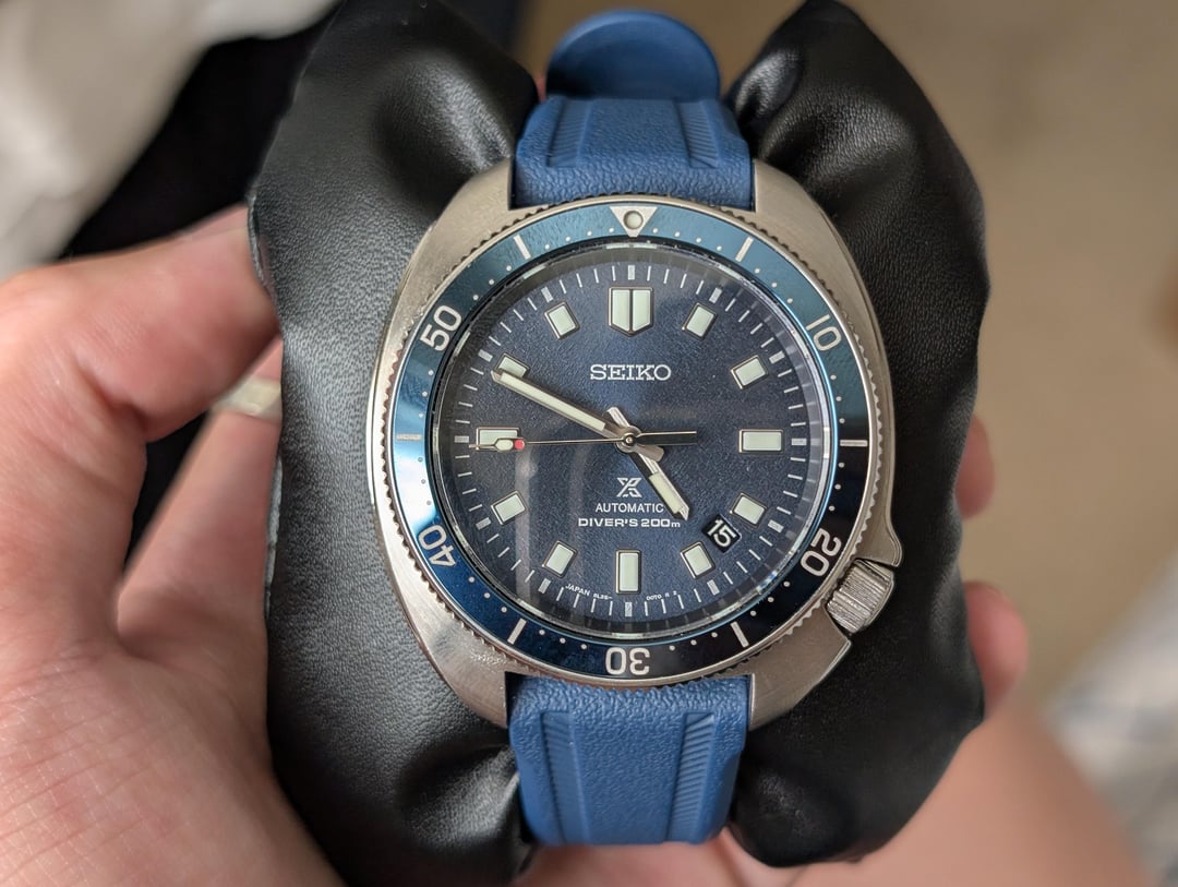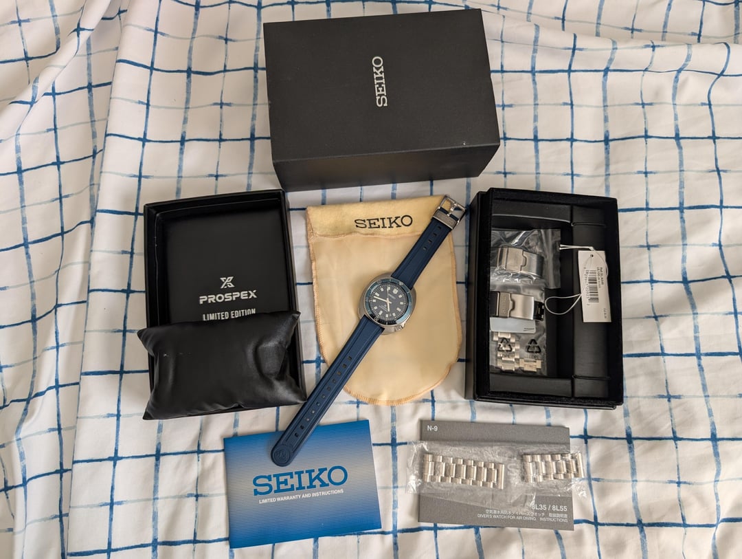 **Price: $1400 shipped CONUS via PayPal FF/Zelle. No trades at the time.** Hello everyone, Looking to recoup some funds and haven't been wearing this watch anymore. I brought the watch to get the bezel fixed as it was very hard to turn and it's working smoothly now. This is a hefty watch, especially on the bracelet, but it feels very solid overall. It has mixture of brushed and mirror polishing on the case that reveals a higher quality of finishing than normal Seiko divers. The dial has a nice texture that appears best in direct sunlight, and the blue bezel has a nice sheen that compliments the dial well. There is some wear on the sides of the mirror polished case and some on the back of the lugs. I have also circled in red some marks on the top of the brushed case. There are also some faint marks on the polished bezel. Overall, the watch is still in great condition. The watch will come with the original outer and inner box, manual, warranty card (undated), hang tags, etc. The watch comes with the original rubber strap, bracelet, and additional Seiko titanium+stainless steel ratcheting clasp. The bracelet is currently sized to my 6.25" wrist and comes with 5 extra links. The Seiko 8L movement is running great. Please PM me with any questions you might have. Thanks! **Watch specs:** * Case Size (without crown): 44.0mm * Case Thickness: 13.0mm * Case Lug to Lug: 49.3mm * Case Material: Stainless steel with super-hard coating and zaratsu polishing * Crystal Material: Curved sapphire crystal with inner anti-reflective coating * Water Resistance: 200m * Lug Width: 20mm * Movement: Seiko 8L35 (automatic)