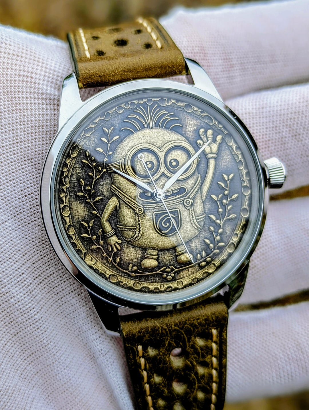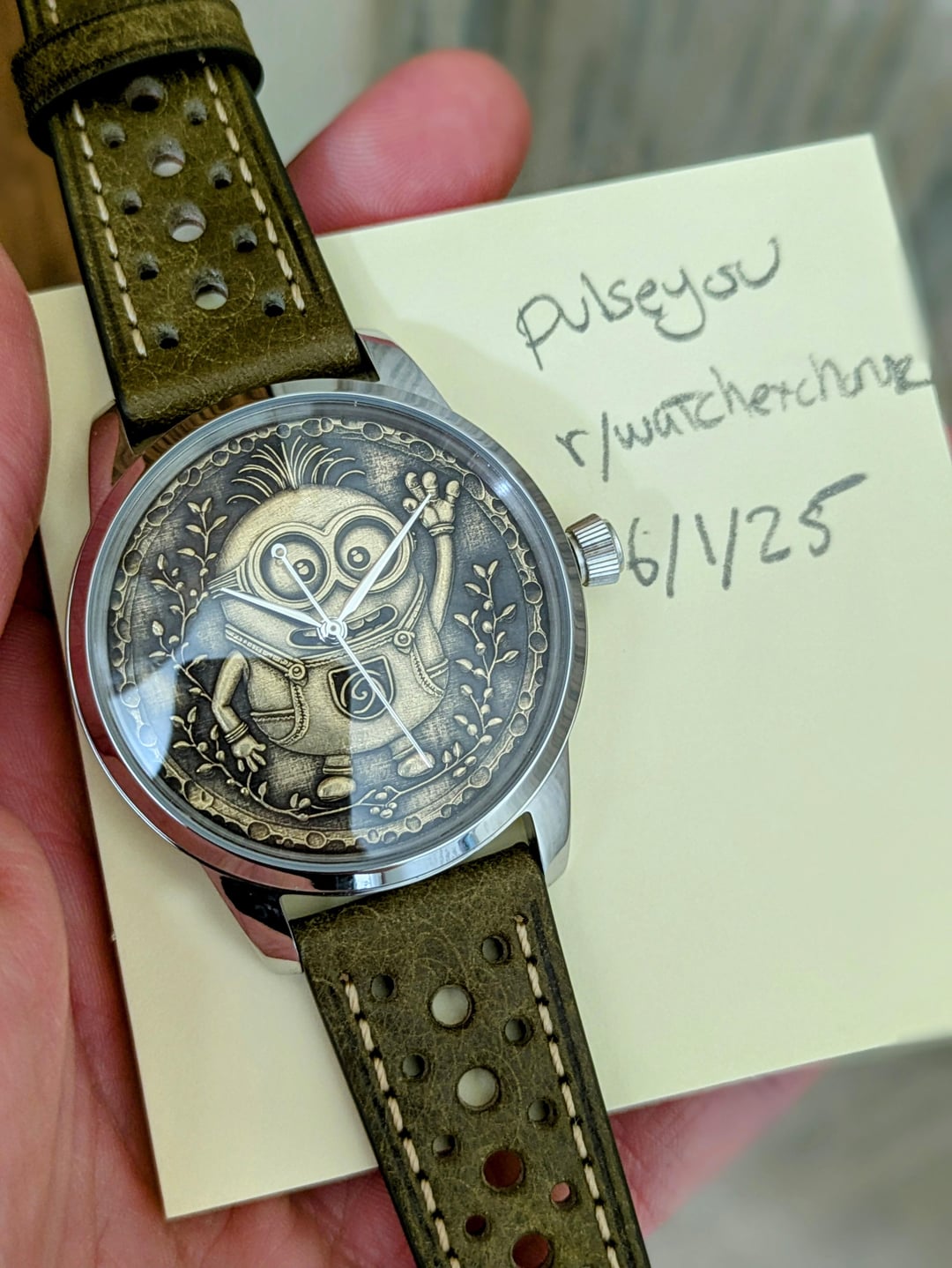 Good morning watch fam! For sale today we have a brand new CCW "Minion." This dial was cut out of a 0.5mm sheet of jeweler's bronze on my 50w fiber laser, it has 256 layers to create a 3d effect on the dial, and then hand finished with Brass Black, Flitz Polish, and Renaissance Wax. The dial itself is 35mm which is a gorgeous size, a standard dial is 28.5mm so this dial is about 50% bigger to show the details. I have housed the dial in a beautiful 39mm dress watch case and it powered on a new NH38 automatic movement, an absolute workhorse at this price point. The watch features an open caseback with a gold adorned rotor. I have a brown or green leather strap available, as well as a brand new Strapcode fine mesh milanese bracelet (my personal favorite). *All of my watches are completely customizable so if you would like to change anything about the watch please shoot me a message and would be happy to create something custom to fit your needs, or customize this dial further.* **Specs** Case Size: 39mm stainless steel dress case w/ open caseback and 20mm lugs. Strap Option #1: Sleek 20mm leather strap with steel buckle. Strap Option #2: Very comfortable fine mesh Strapcode milanese bracelet. Dial: Custom designed, lasered, and hand finished 35mm dial featuring my son's favorite movie. 256 layers, for a video of this dial being made please see my IG linked below. Movement: NH38 Movement w/ 41+ hour power reserve, hacking, 24 Jewels, Open caseback with adorned rotor. 12.5mm Thickness Comes with a travel watch pouch for safekeeping :\] **Condition** Everything is brand new and ready to be shipped. Watch was custom-built by me to the highest quality. Message me if you have any questions. **Asking** $299 (leather strap) or $330 (milanese bracelet) shipped to CONUS. Will ship to other countries please contact me with location and I'll see what I can do. Payment via Venmo, Zelle, Cashapp, or Paypal+3%. [Other Custom Watches on my IG](https://www.instagram.com/cacustomwatches/)