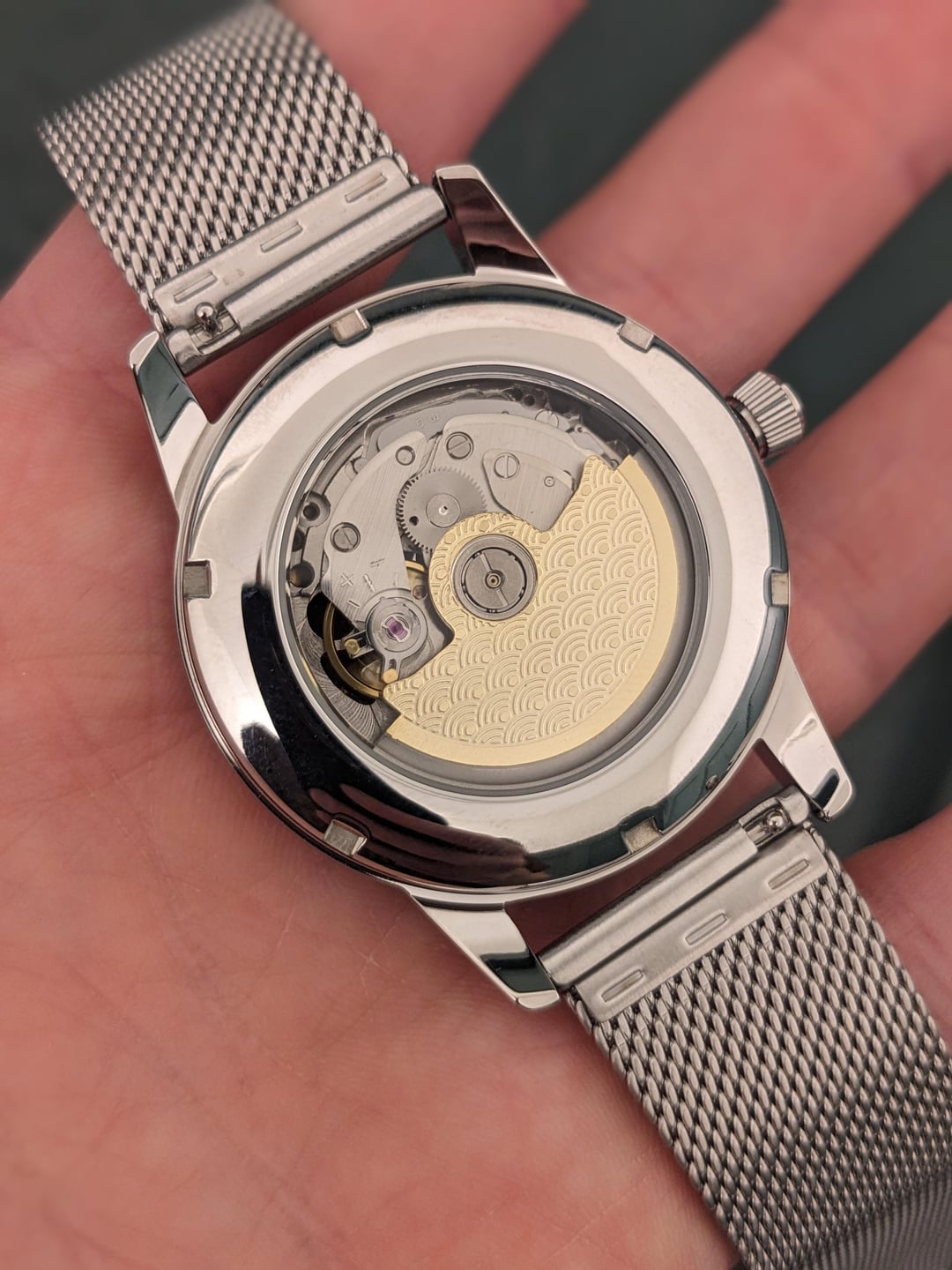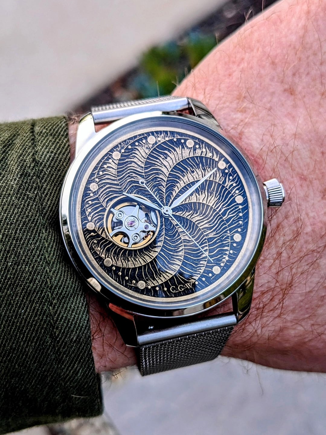 [Link to the dial being made.](https://www.instagram.com/reel/DFjQ9E1SztA/?utm_source=ig_web_copy_link&igsh=MzRlODBiNWFlZA==) Good morning and happy Sunday. Thank you for browsing my watch sale. Today we have a brand new CCW Spiral. This dial made by me on my 50w fiber laser. It has 256 layers to create a 3d effect on the dial, cut out of a 0.5mm sheet of jeweler's bronze and then hand finished with Brass Black, Polish, and Renaissance Wax. The dial is 35mm which is a gorgeous size, a standard dial is 28.5mm so this dial is about 50% bigger. I have housed the dial in a 39mm dress watch case and it runs on a new NH38 automatic movement, with the "open heart" near the 9 o clock indice. The watch features an open caseback with a gold adorned rotor. This watch is available on a fine mesh milanese bracelet or a leather strap (black, brown, green black). ***\*All of my watches are completely customizable so if you would like to change anything about the watch please shoot me a message and would be happy to create something custom to fit your needs, or customize this dial further.*** **Specs** Case Size: 39mm stainless steel dress case. Bracelet: Superfine mesh Strapcode high quality bracelet Strap: Sleek 20mm leather strap with steel buckle. Dial: Custom designed, lasered, and hand finished 35mm dial featuring a a spiral pattern and displaying the nh38 open heart. Movement: NH38 Seiko Movement w/ 41+ hour power reserve, hacking, 24 Jewels, Open caseback with adorned rotor. 12.5mm Thickness Comes with a travel watch pouch for safekeeping **Condition** Everything is brand new and ready to be shipped. Watch was custom-built by me to the highest quality. Message me if you have any questions. **Asking** $299 shipped to CONUS on a leather strap, 330 shipped on the milanese bracelet. Will ship to other countries please contact me with location and I'll see what I can do. Payment via Venmo, Zelle, Cashapp, or Paypal+3%. [Other Custom Watches on my IG](https://www.instagram.com/cacustomwatches/)