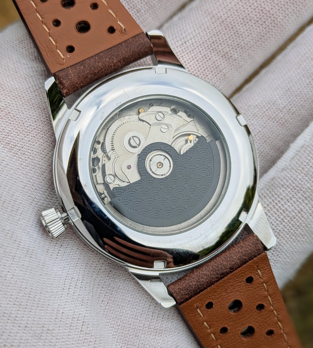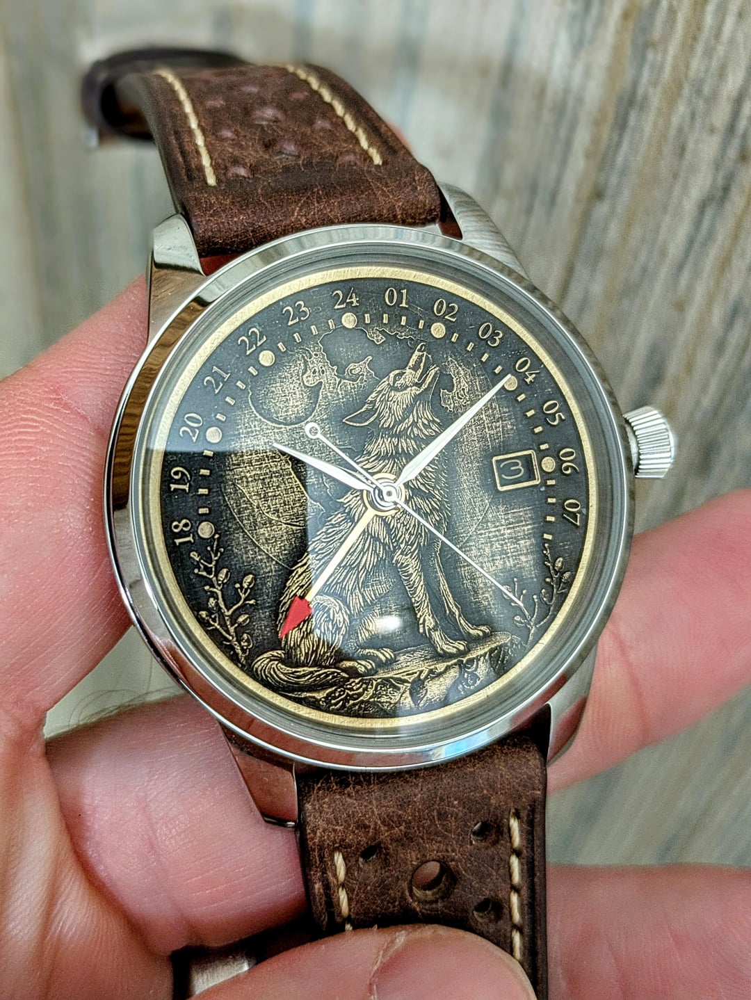 Good morning and happy Monday. Thank you for browsing my watch sale. Today we have a brand new CCW Wolf GMT. This dial made by me on my 50w fiber laser. It has 256 layers to create a 3d effect on the dial, cut out of a 0.5mm sheet of jeweler's bronze and then hand finished with Brass Black, Polish, and Renaissance Wax. The dial is 35mm which is a gorgeous size, a standard dial is 28.5mm so this dial is about 50% bigger. I have housed the dial in a 39mm dress watch case and it runs on a new NH34 automatic GMT movement, with an independently controlled GMT hand. The watch features an open caseback with a gold adorned rotor. This watch is available on a fine mesh milanese bracelet or a leather strap (black, brown, green black). ***\*All of my watches are completely customizable so if you would like to change anything about the watch please shoot me a message and would be happy to create something custom to fit your needs, or customize this dial further.*** **Specs** Case Size: 39mm stainless steel dress case. Bracelet: Superfine mesh Strapcode high quality bracelet Strap: Sleek 20mm leather strap with steel buckle. Dial: Custom designed, lasered, and hand finished 35mm dial featuring a a spiral pattern and displaying the nh38 open heart. Movement: NH38 Seiko Movement w/ 41+ hour power reserve, hacking, 24 Jewels, Open caseback with adorned rotor. 12.5mm Thickness Comes with a travel watch pouch for safekeeping **Condition** Everything is brand new and ready to be shipped. Watch was custom-built by me to the highest quality. Message me if you have any questions. **Asking** $299 shipped to CONUS on a leather strap, 330 shipped on the milanese bracelet. Will ship to other countries please contact me with location and I'll see what I can do. Payment via Venmo, Zelle, Cashapp, or Paypal+3%. [Other Custom Watches on my IG](https://www.instagram.com/cacustomwatches/)