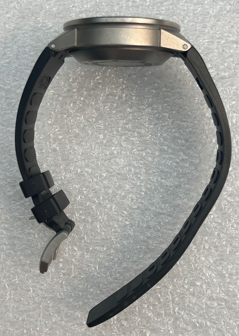 Up for sale is an IWC Aquatimer titanium dive watch with a 2000m depth rating. The watch is on an IWC black rubber strap with an IWC titanium tang buckle. The watch has an internal rotating bezel as well.